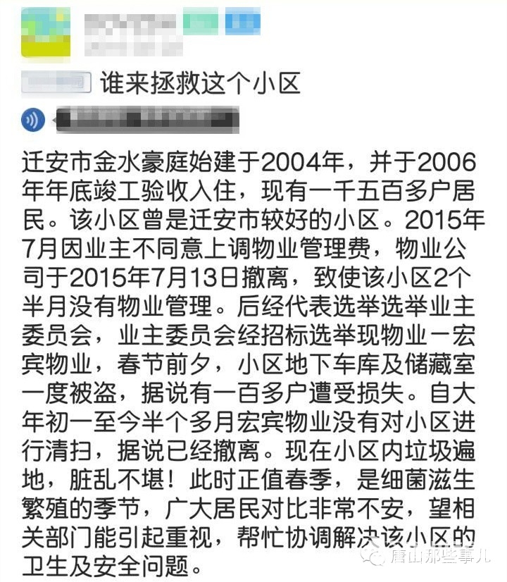 物業(yè)與業(yè)主之間的矛盾從始至終都是一個困擾不少市民的問題,如何協(xié)調(diào)好物業(yè)公司與業(yè)主之間的關(guān)系也一直是人們在關(guān)心著的,近日就有遷安的網(wǎng)友在網(wǎng)上發(fā)帖哭訴:拿什么拯救你,我的小區(qū)。