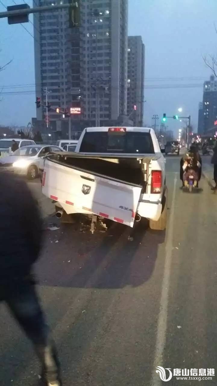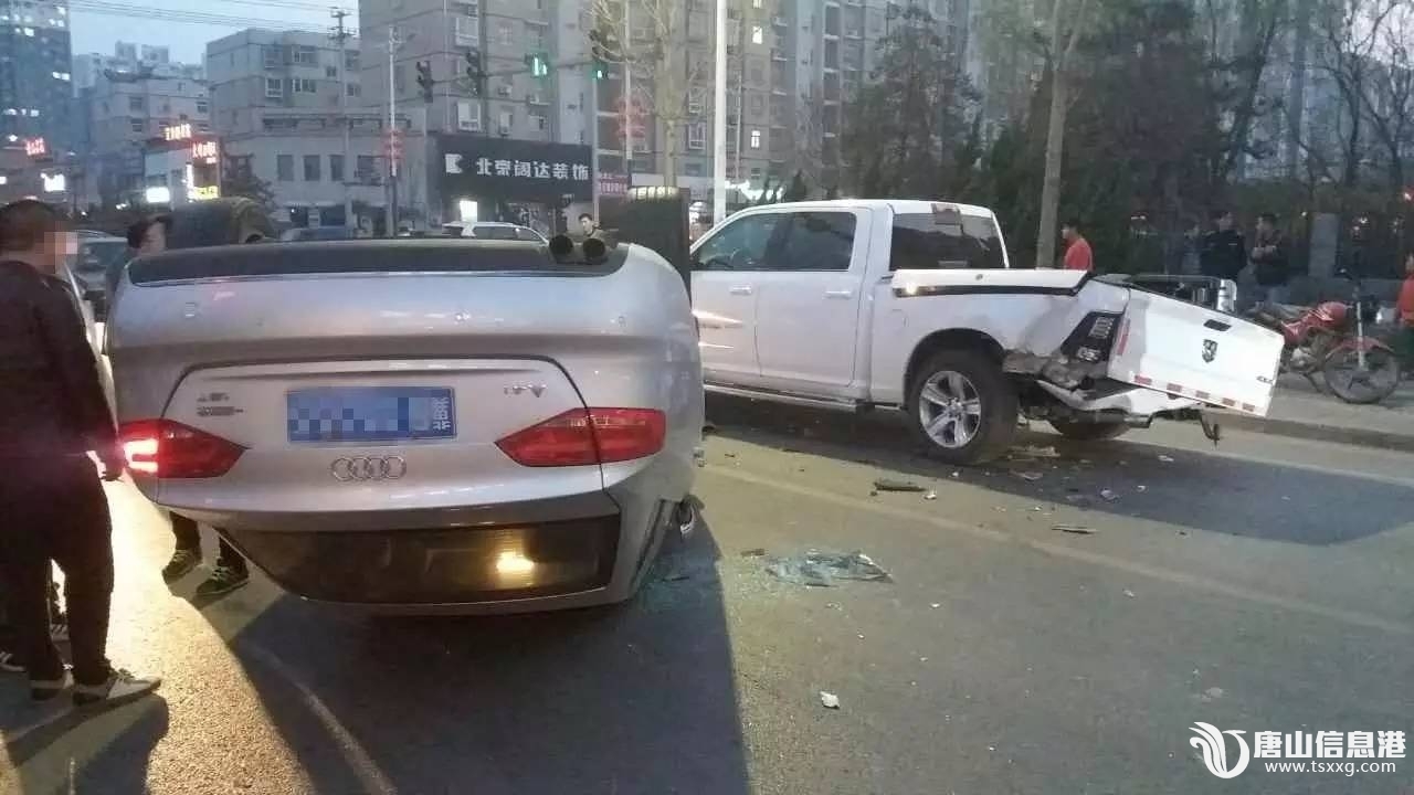 據(jù)網(wǎng)友爆料,今天傍晚六點半左右,在唐海匯豐路與建設(shè)大街紅綠燈路口,一輛奧迪A4轎車追尾道奇皮卡后翻車,A4車頭受損嚴(yán)重,皮卡尾部被撞變形,所幸沒有人員傷亡。 感謝網(wǎng)友小郝的獨家爆料,請聯(lián)系工作人 ...