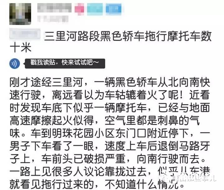 網(wǎng)友爆料,昨天(5月17日)晚上九點(diǎn)半左右,在經(jīng)過遷安市三里河公園附近時(shí)目睹了駭人的一幕:一輛小轎車拖著一輛摩托車一路狂奔,火花四濺!
