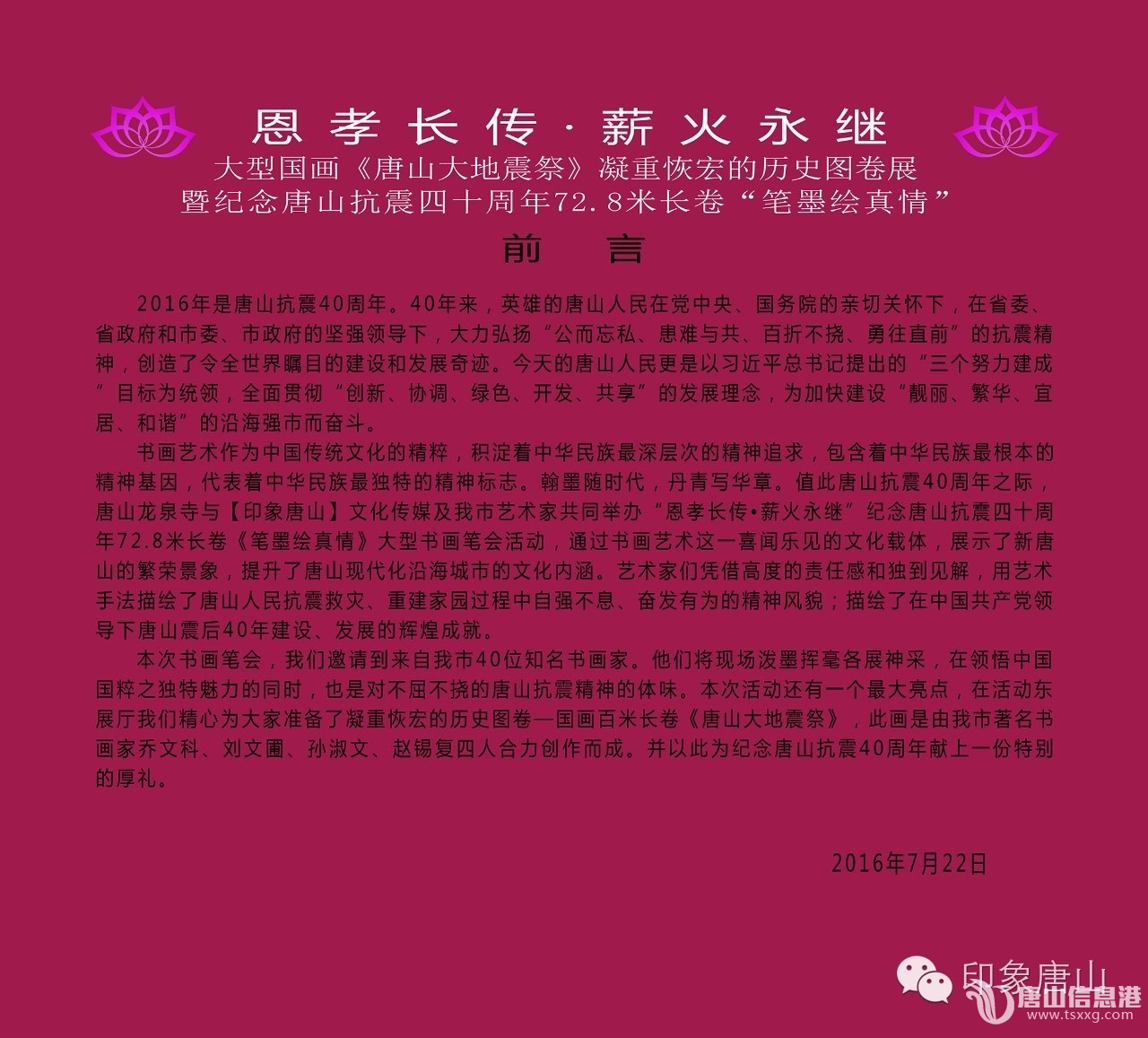 恩孝長傳·薪火永繼大型國畫《唐山大地震祭》凝重恢宏的歷史圖卷展暨紀(jì)念唐山抗震四十周年72.8米長卷“筆墨繪真情” 書畫藝術(shù)作為中國傳統(tǒng)文化的精粹,積淀著中華民族最深層次的精神追求,包含著中華 ...