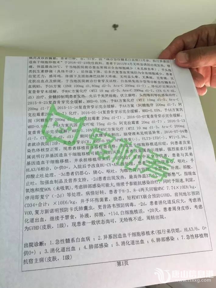 來源:輕松籌白靜,女,身份證號(hào)130221198507225128.家住河北省唐山市豐潤區(qū)白官屯鎮(zhèn)白官屯村。 2015年5月13日在中國醫(yī)學(xué)科學(xué)院血液病醫(yī)院確診為急性髓系白血病m5。從那日起至2016年7月在血液病醫(yī)院(天津)化療了 ...