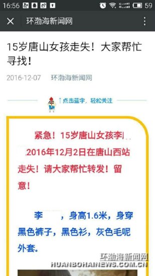 12月7日晚,環(huán)渤海新聞網(wǎng)微信公眾號發(fā)出的信息 環(huán)渤海新聞網(wǎng)消息 (紀哲)12月8日下午4時許,失聯(lián)近1周的遷西15歲女孩李某某成功聯(lián)系上家人,現(xiàn)已平安返校。 據(jù)李某某父親介紹,孩子在古冶車站找到, ...