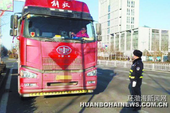 2月9日上午交警在唐安路查獲26輛違法貨車 圖為民警查獲違反限行規(guī)定的大貨車。警方提供 環(huán)渤海新聞網(wǎng)消息 (記者 魏偉)昨天上午,市公安交警支隊二大隊根據(jù)相關部署,開展五軸及以上大貨車違反限行規(guī)定治理 ...