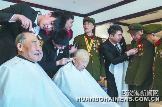 環(huán)渤海新聞網(wǎng)消息 昨天上午,常記功臣幸福院擁軍愛(ài)民展館內(nèi),工作人員張啟龍等正在為年逾古稀的革命老功臣孟慶智(前左一)、劉勝(前左二)“剃龍頭”。當(dāng)天是農(nóng)歷二月初二,民間素有“二月二剃龍頭”的習(xí)俗 ...
