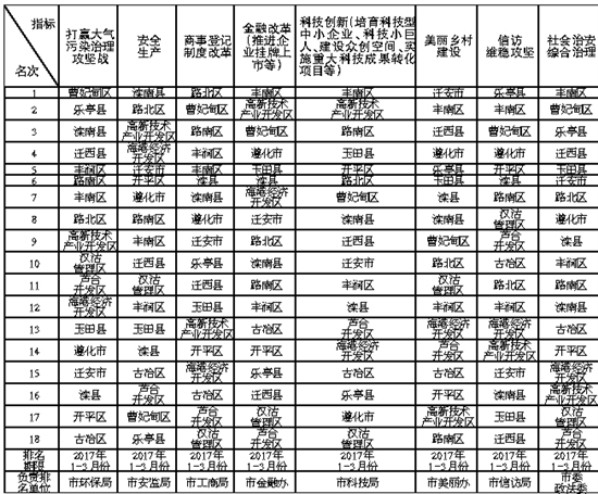 2017年各縣(市、區(qū))落實(shí)全市重點(diǎn)工作指標(biāo)情況排名 備注:1.此表為唐山市各縣(市、區(qū))落實(shí)全市重點(diǎn)工作關(guān)于保持經(jīng)濟(jì)增長(zhǎng)情況排名(共細(xì)化為4項(xiàng)指標(biāo),分別是投資增長(zhǎng)、一般公共預(yù)算收入、規(guī)模以上工業(yè)增加值和GD ...