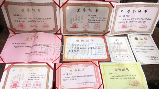 <p> </p> <p>馮波在騎行路上宣傳無償獻血的部分獻血證 </p> <p> 環(huán)渤海新聞網(wǎng)專稿 一個人,一輛單車,一面旗幟,這就是馮波騎行路上的全部裝備。"我要堅持無償獻血到獻不動 ...