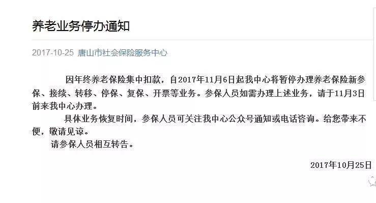 因年終養(yǎng)老保險集中扣款,自2017年11月6日起我中心將暫停辦理養(yǎng)老保險新參保、接續(xù)、轉(zhuǎn)移、停保、復保、開票等業(yè)務。參保人員如需辦理上述業(yè)務,請于11月3日前來我中心辦理。 具體業(yè)務恢復時間,參保人員可關 ...