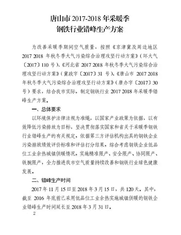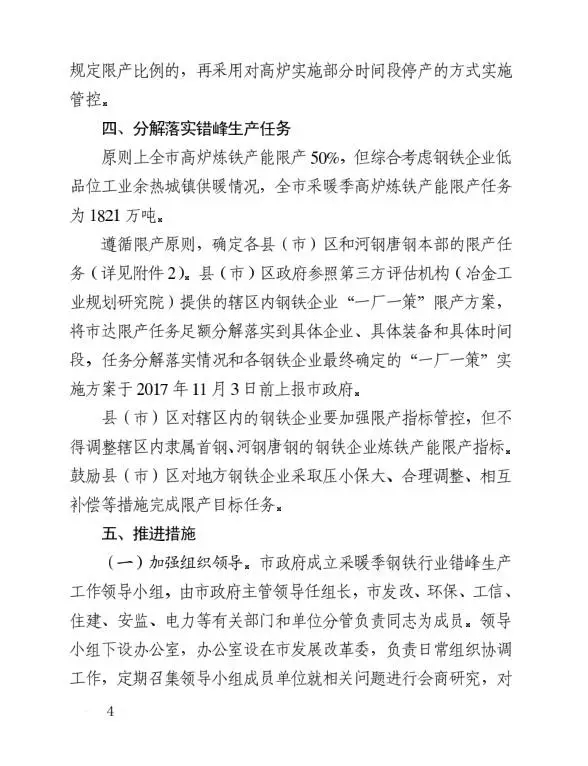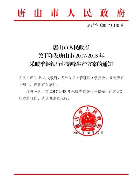 唐山市政府下發(fā)2017-2018年采暖季鋼鐵企業(yè)高爐錯(cuò)峰生產(chǎn)實(shí)施方案,11月15日至3月15日鋼鐵企業(yè)高爐限產(chǎn)120天,全市總限產(chǎn)比例為50%,四個(gè)月合計(jì)影響高爐生鐵總量為1821萬(wàn)噸。