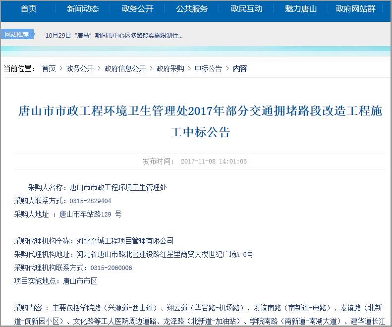 唐山網(wǎng)站11月8日發(fā)布《唐山市市政工程環(huán)境衛(wèi)生管理處2017年部分交通擁堵路段改造工程施工中標(biāo)公告》,公告稱將對部分交通擁堵路段進(jìn)行改造工程施工。 中國·唐山網(wǎng)站11月8日發(fā)布《唐山市市政工程環(huán)境衛(wèi)生 ...