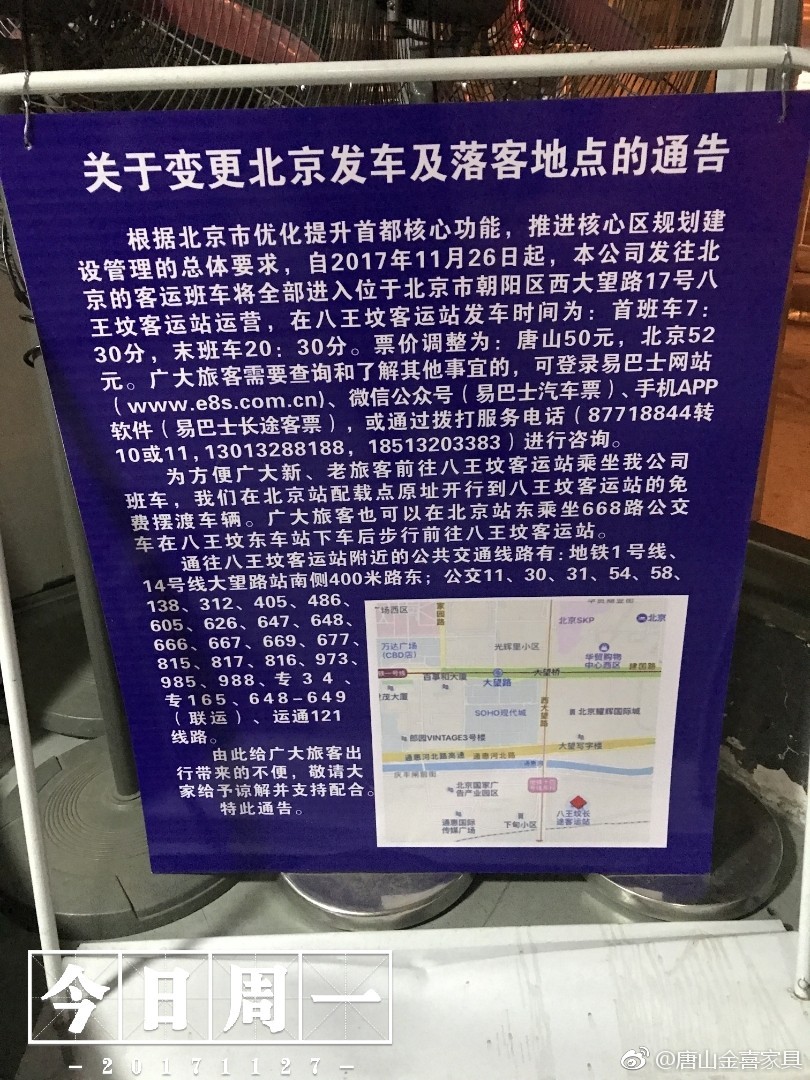 自11月26日起,疏解關(guān)停位于北京站前郵通街北鮮魚巷內(nèi)的八王墳長途客運(yùn)站北京站配載點,原在該站點運(yùn)行的北京至唐山客運(yùn)班線及車輛,全部遷至位于朝陽區(qū)西大望路17號的八王墳客運(yùn)站繼續(xù)運(yùn)營。票價調(diào)整為唐山50元,北 ...