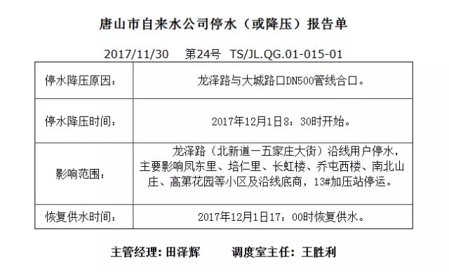 自來水公司定于2017年12月1日8:30—17:00進(jìn)行龍澤路與大城路口DN500管線合口。屆時龍澤路(北新道—五家莊大街)沿線用戶停水,主要影響鳳東里、培仁里、長虹樓、喬屯西樓、南北山莊、高第花園等小區(qū)及沿線底商,1 ...