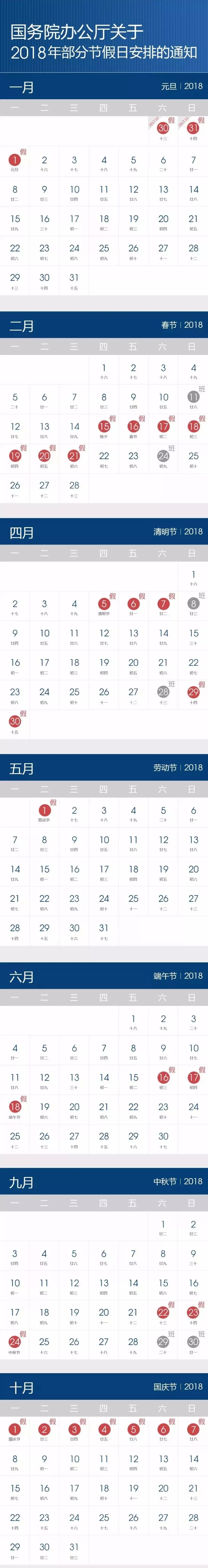 國(guó)務(wù)院辦公廳發(fā)布關(guān)于2018年部分節(jié)假日安排的通知。2018年元旦、春節(jié)、清明節(jié)、勞動(dòng)節(jié)、端午節(jié)、中秋節(jié)和國(guó)慶節(jié)放假調(diào)休日期的具體安排如下 一、元旦:1月1日放假,與周末連休。 二、春節(jié):2月15日至21日放假調(diào) ...