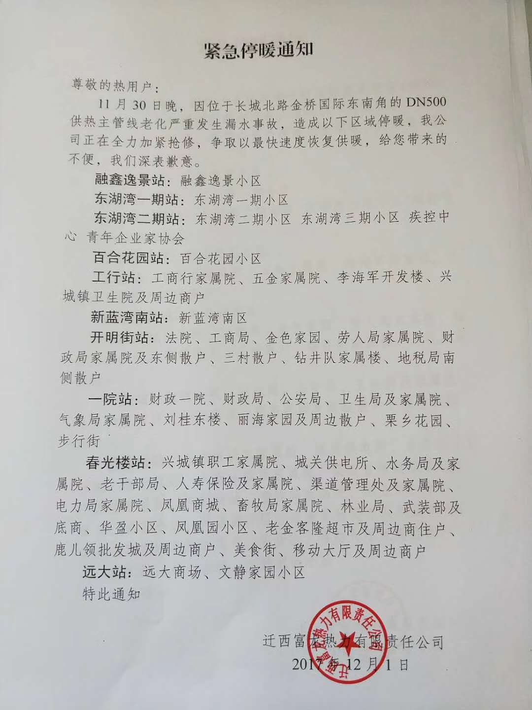 1、遷西這些區(qū)域臨時(shí)停暖11月30日晚,因位于長城北路金橋國際東南角的DN500供熱主管線老化嚴(yán)重發(fā)生漏水事故,造成以下區(qū)域停暖