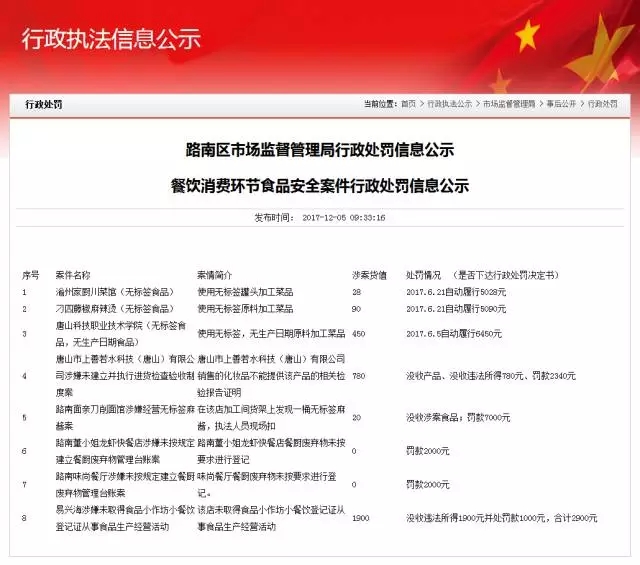 路南區(qū)人民政府官網(wǎng)發(fā)布《路南區(qū)市場監(jiān)督管理局行政處罰信息公示》對餐飲消費環(huán)節(jié)食品安全案件行政處罰信息進行公示,這些單位被曝光↓↓↓ 案件名稱案情簡介涉案貨值處罰情況 (是否下達行政處罰決定書 ...