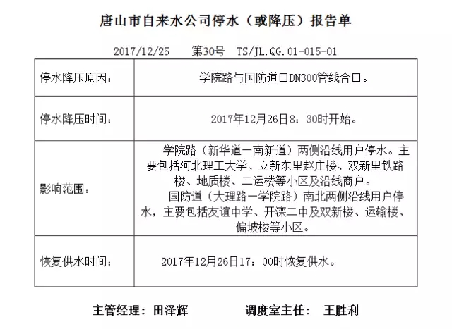 停水通知 自來水公司定于2017年12月26日8:30—17:00進(jìn)行學(xué)院路與國防道口DN300管線合口。屆時(shí)學(xué)院路(新華道—南新道)沿線兩側(cè)用戶停水。主要包括華北理工大學(xué)、立新東里趙莊樓、雙新里鐵路樓、地質(zhì)樓、二運(yùn)樓等 ...