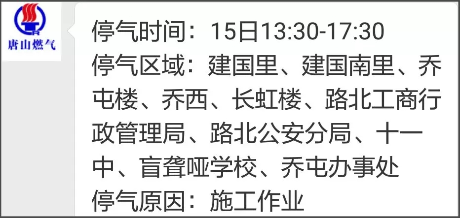 今天(1月13日),唐山市燃?xì)饧瘓F(tuán)發(fā)布停氣公告,因施工作業(yè),1月15日13:30-17:30,建國(guó)里、建國(guó)南里、喬屯樓、喬西、長(zhǎng)虹樓、路北工商行政管理局、路北公安分局、十一中、盲聾啞學(xué)校、喬屯辦事處將停止供氣。 ...