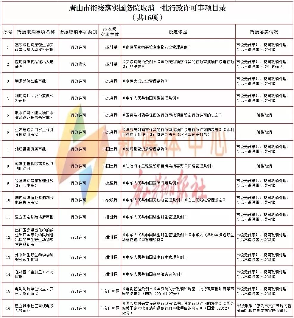 近日,市編辦(市審改辦)完成銜接落實國務(wù)院取消一批行政許可事項工作,銜接取消16項行政許可事項。對已取消的事項,各級各部門已按要求全部停止審批,并堅決杜絕拆分、合并或重組以新的名義、條目變相審批。 唐 ...