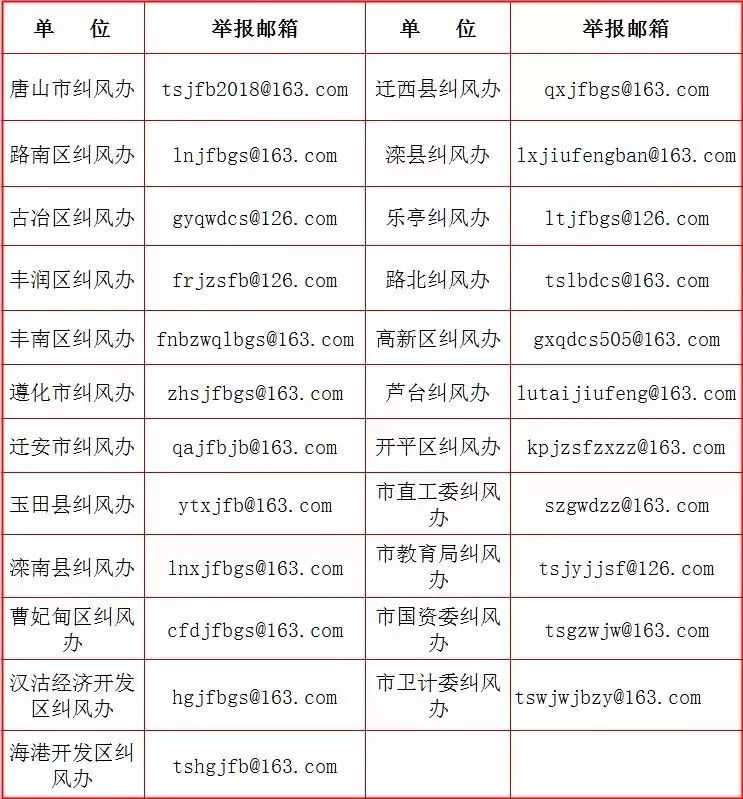 日前,唐山市公布相關(guān)單位糾風(fēng)系統(tǒng)舉報郵箱,具體內(nèi)容如下 來源:唐山新聞