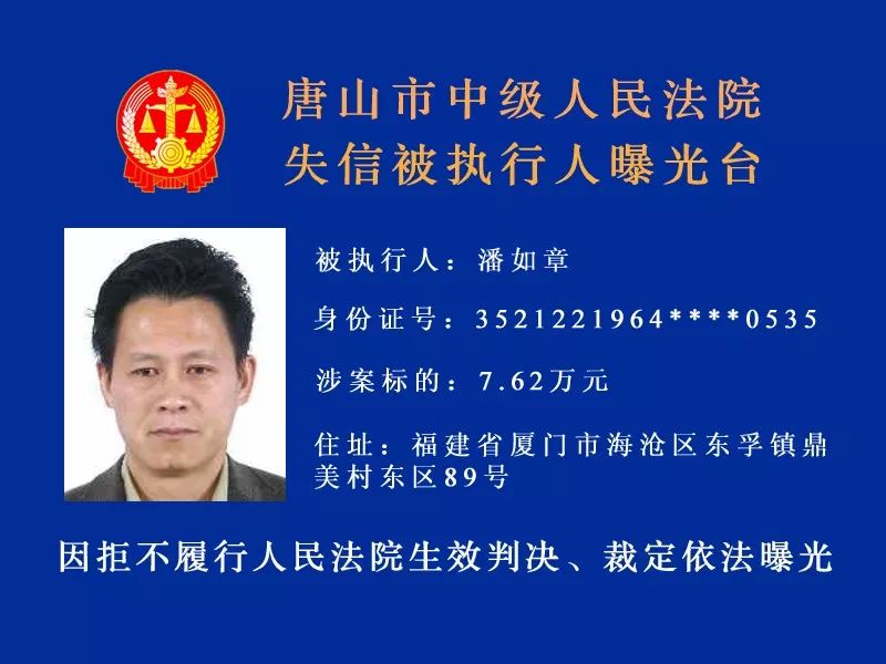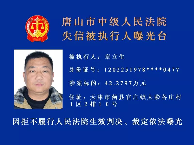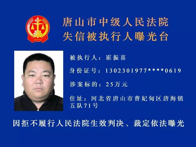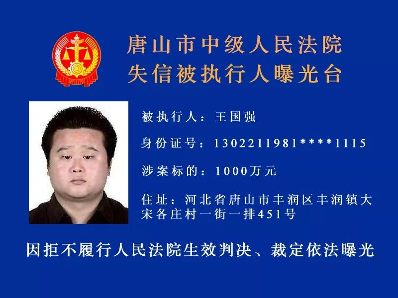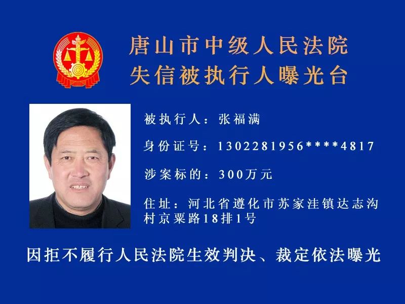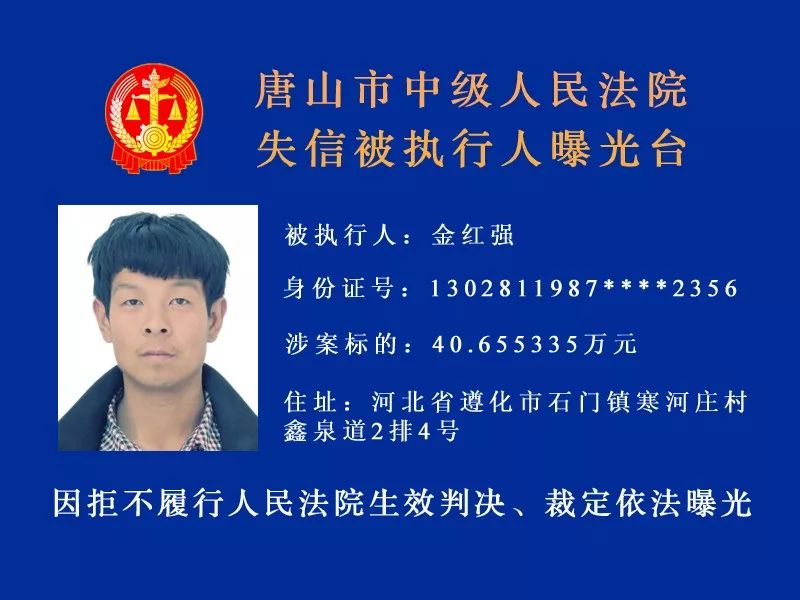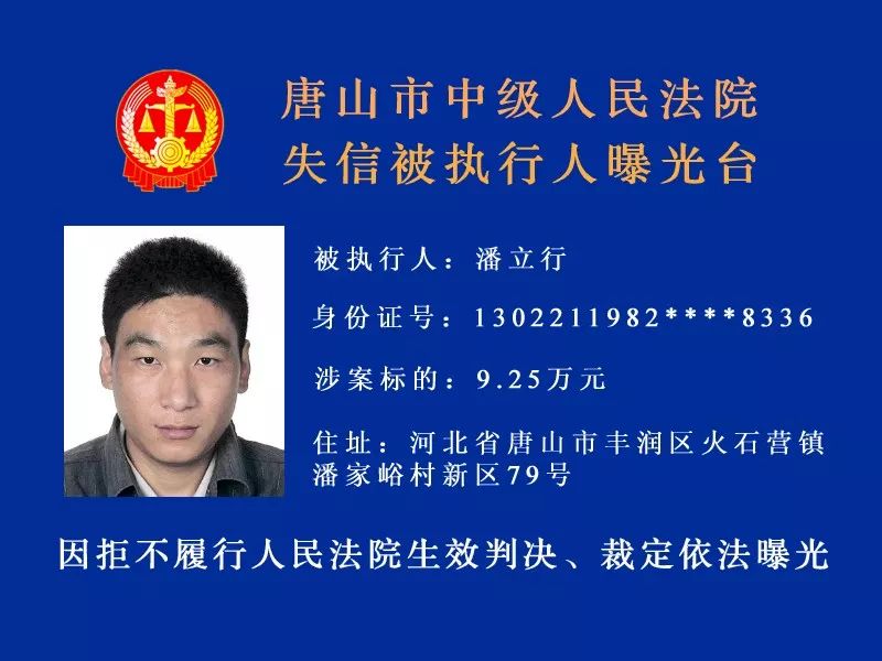 俗話說:欠債還錢,天經(jīng)地義可就是有一些猖狂的老賴借了錢卻想方設(shè)法地賴掉不肯還 曝光內(nèi)容由執(zhí)行法院提供,如有疑問請與執(zhí)行法院聯(lián)系。 歡迎社會各界和廣大人民群眾積極舉報被執(zhí)行人下落及可供執(zhí)行財產(chǎn) ...