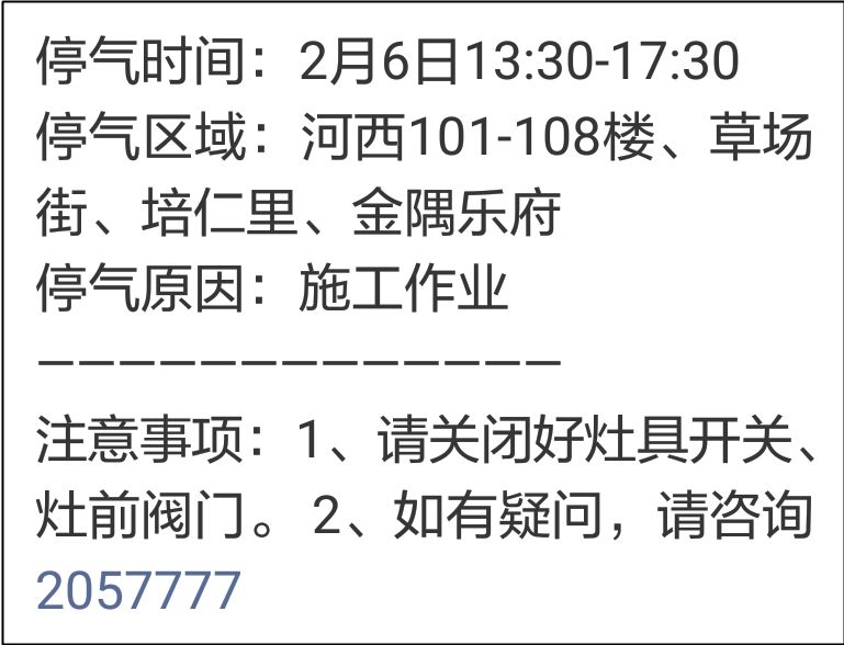 今天,唐山燃?xì)饧瘓F(tuán)公司官網(wǎng)發(fā)布停氣公告,因施工作業(yè),2月6日13:30-17:30,河西101-108樓、草場街、培仁里、金隅樂府將停止供氣。 來源:唐山燃?xì)?/p>