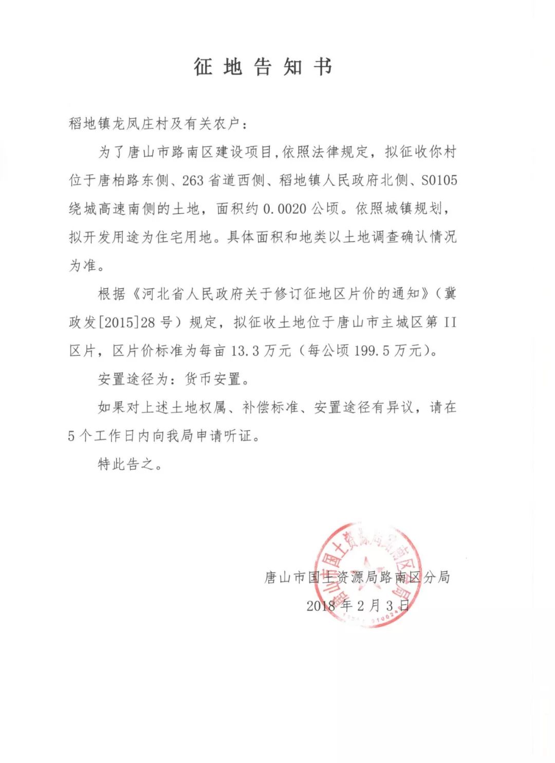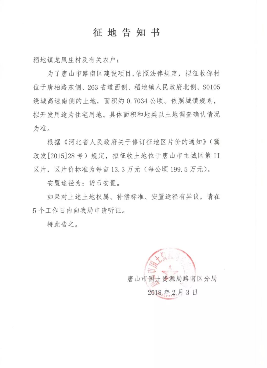 2月5日,路南區(qū)人民政府網(wǎng)站發(fā)布了唐山市國土資源局路南區(qū)分局征地告知書,為了唐山市路南區(qū)建設(shè)項目,擬對稻地鎮(zhèn)龍鳳莊村的土地進(jìn)行征收。 稻地鎮(zhèn)龍鳳莊村征收區(qū)域:唐柏路東側(cè)、263省道西側(cè)、稻地鎮(zhèn)人民政府北 ...