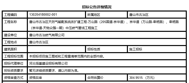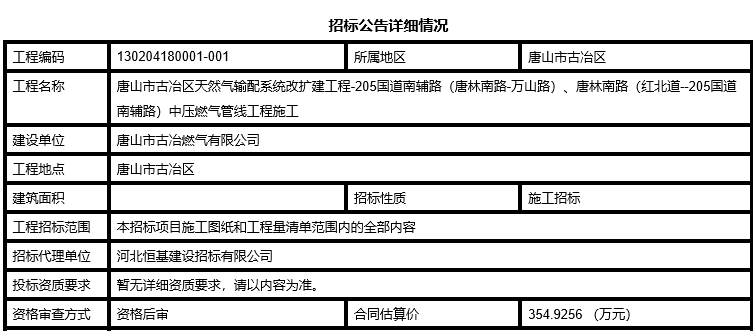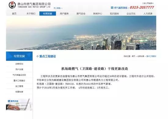 好消息!好消息!唐山市燃?xì)饧瘓F(tuán)公司網(wǎng)站發(fā)布通知燃?xì)飧删要更新改造啦! 01機(jī)場路燃?xì)猓ㄐl(wèi)國路-建設(shè)路)干線將于4月初進(jìn)行更新改造 工程名稱:唐山市古冶區(qū)天然氣輸配系統(tǒng)改擴(kuò)建工程-205國道南輔路(唐 ...