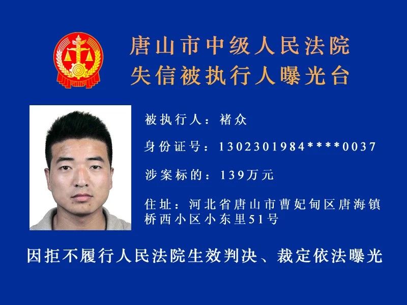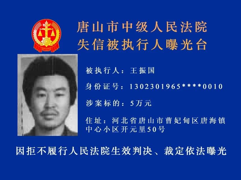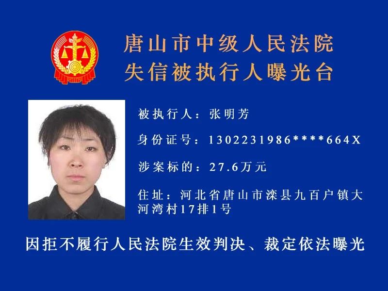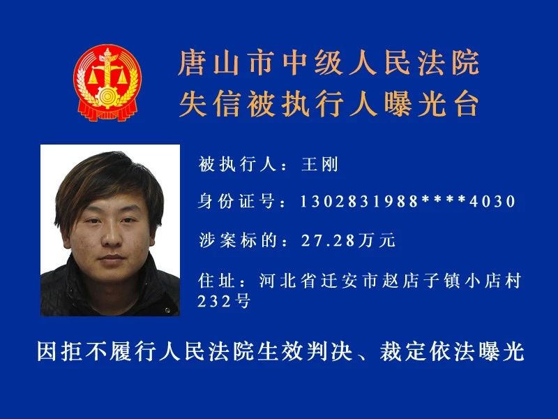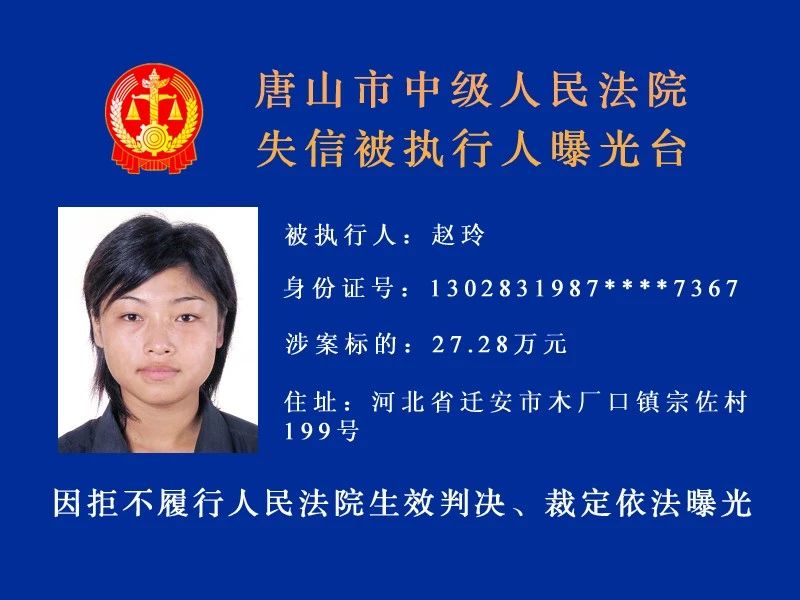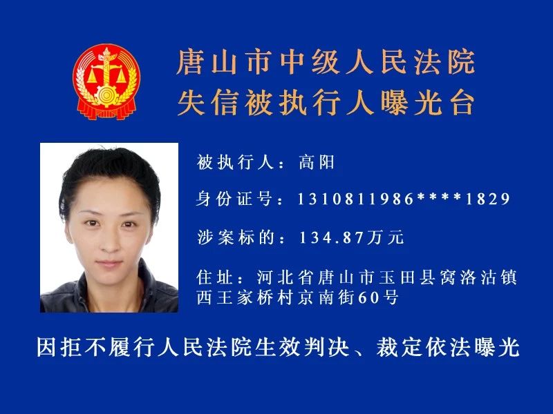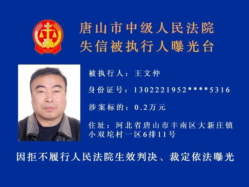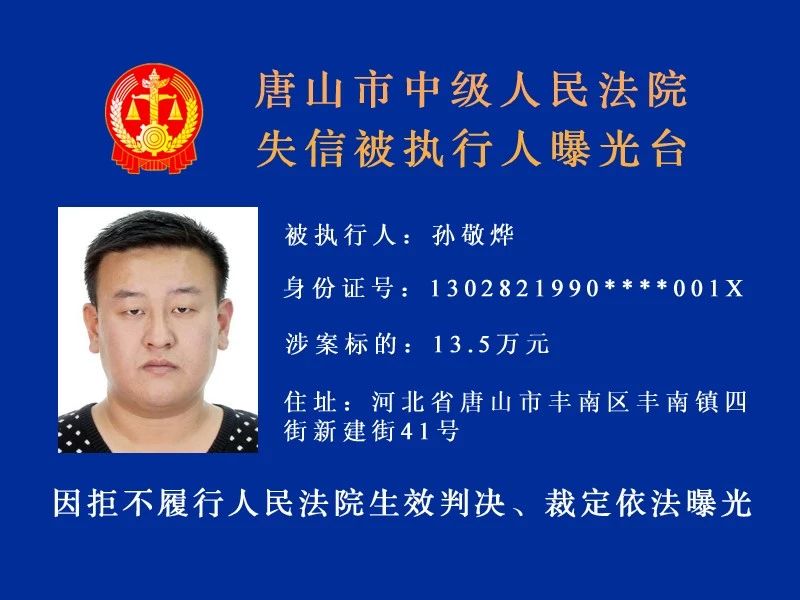 3月31日周六唐山市中級人民法院新一期失信被執(zhí)行人名單公布了!快來看看里面有沒有你認識的人! 什么情形會被列入失信被執(zhí)行人名單 被執(zhí)行人未履行生效法律文書確定的義務,并具有下列情形之一的,人民 ...