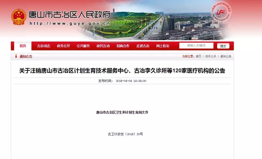 4月4日,唐山市古冶區(qū)衛(wèi)生和計(jì)劃生育局發(fā)布 《關(guān)于注銷唐山市古冶區(qū)計(jì)劃生育技術(shù)服務(wù)中心、 古冶李久診所等120家醫(yī)療機(jī)構(gòu)的公告》