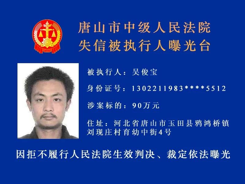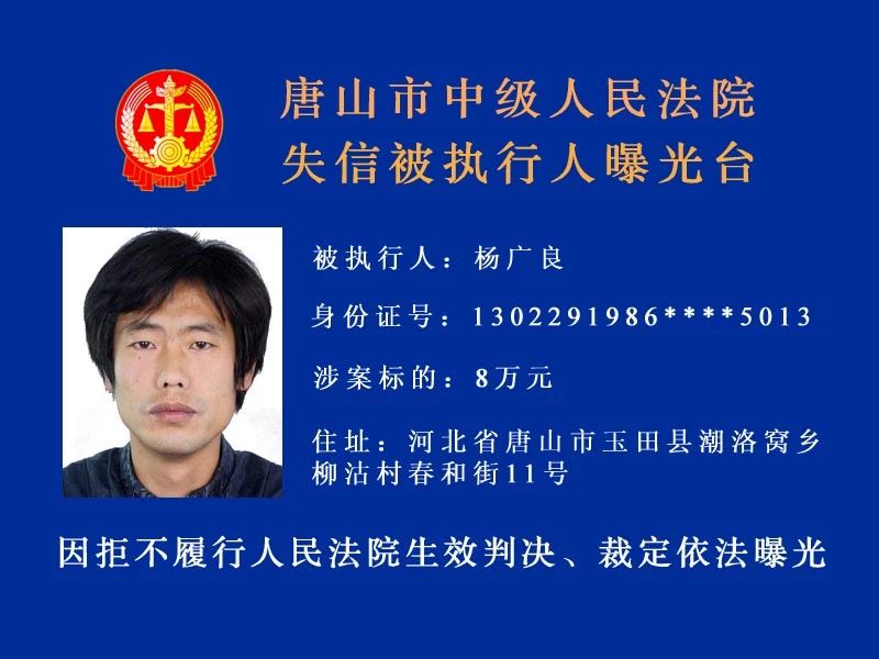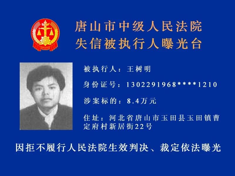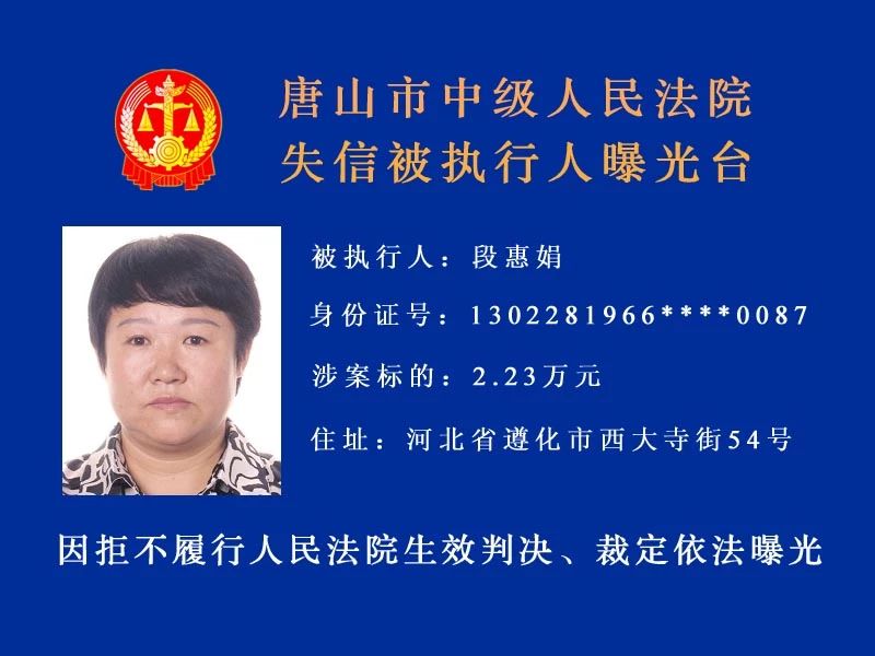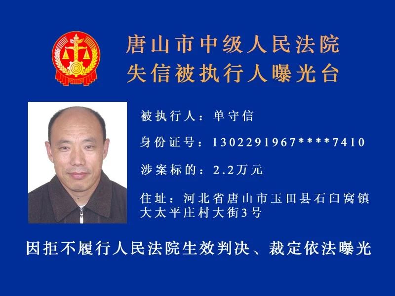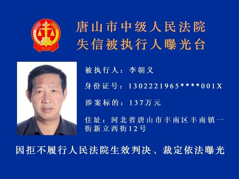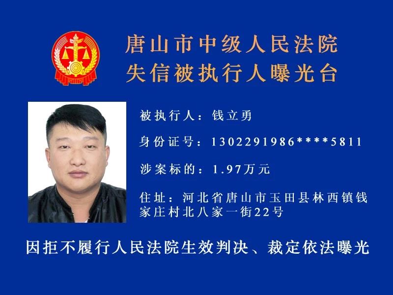 唐山中院曝光了新一批“老賴”名單快來看看里面有沒有你認(rèn)識的人!歡迎社會各界和廣大人民群眾積極舉報被執(zhí)行人下落及可供執(zhí)行財產(chǎn)線索。舉報人提供的財產(chǎn)線索經(jīng)查證屬實并實際執(zhí)行到位 ...