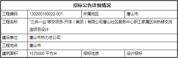 4月28日,河北省住建廳網(wǎng)站發(fā)布招標公告,開灤(集團)有限公司唐山社區(qū)服務中心職工家屬區(qū)要進行供熱移交改造,共涉及29個小區(qū)數(shù)萬戶。 工程名稱:“三供一業(yè)”移交項目-開灤(集團)有限公司唐山社區(qū)服 ...