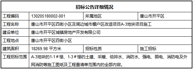 近日,河北省住建廳網(wǎng)站發(fā)布招標(biāo)公告,唐山市開平區(qū)四街小區(qū)及周邊城市棚戶區(qū)改造項(xiàng)目A-3地塊項(xiàng)目,和唐山市古冶區(qū)金山三期震后危舊平房改造項(xiàng)目C、D組團(tuán)工程要進(jìn)行施工。 工程名稱:唐山市古冶區(qū)金山三期 ...