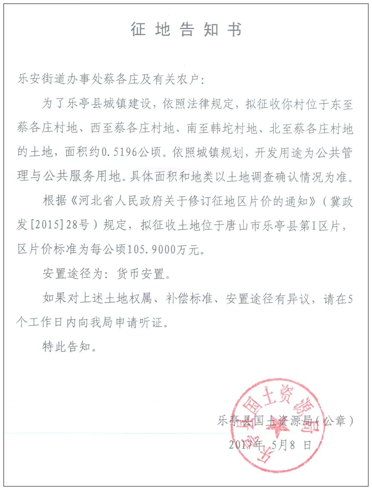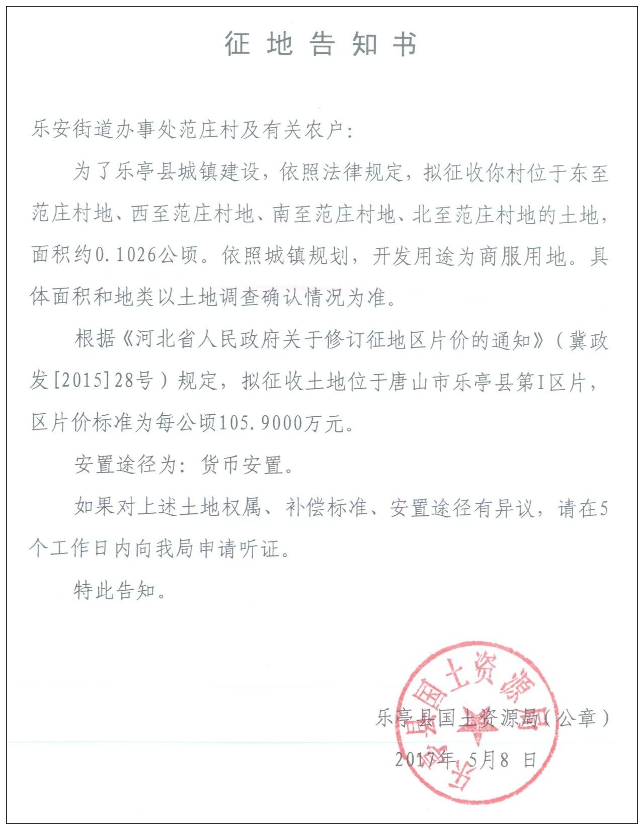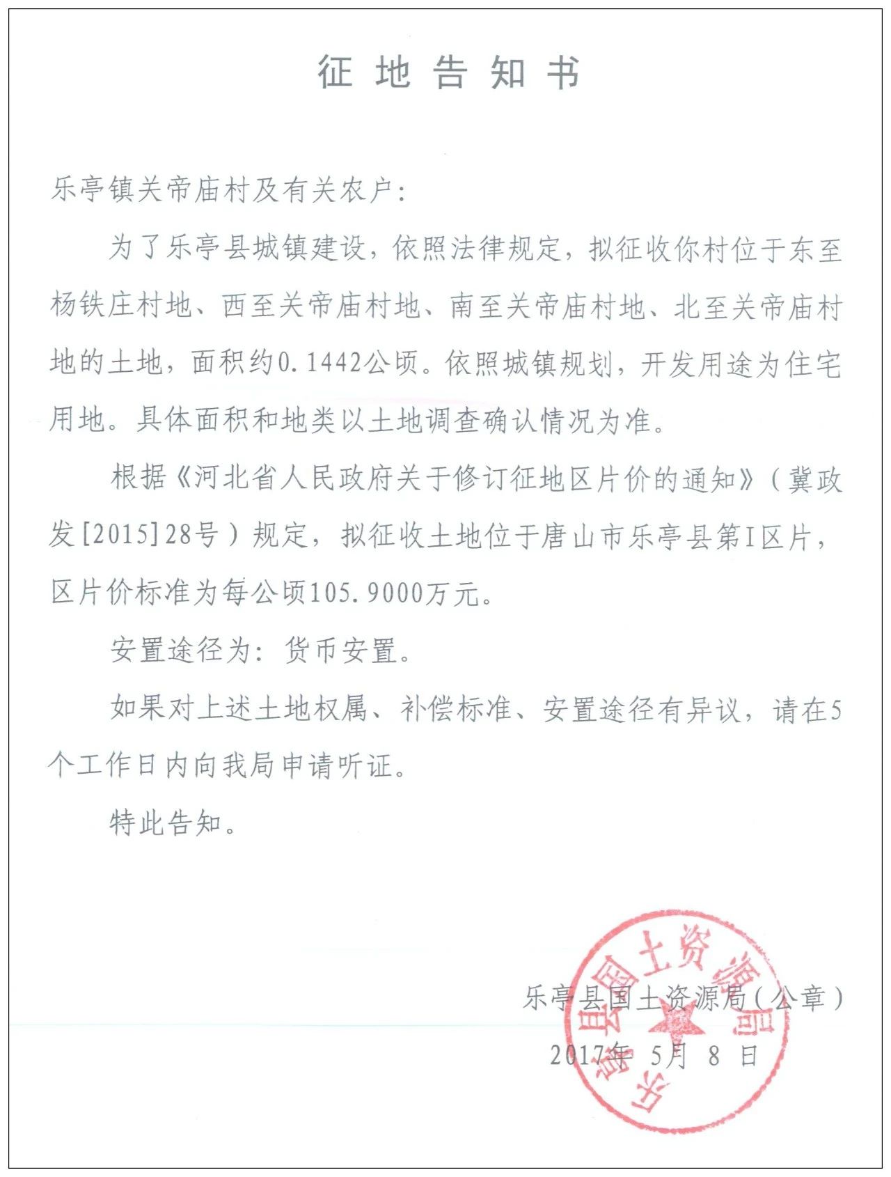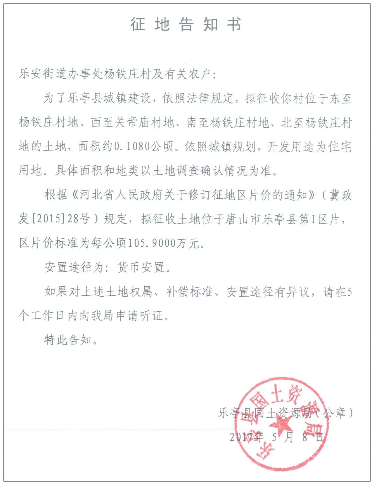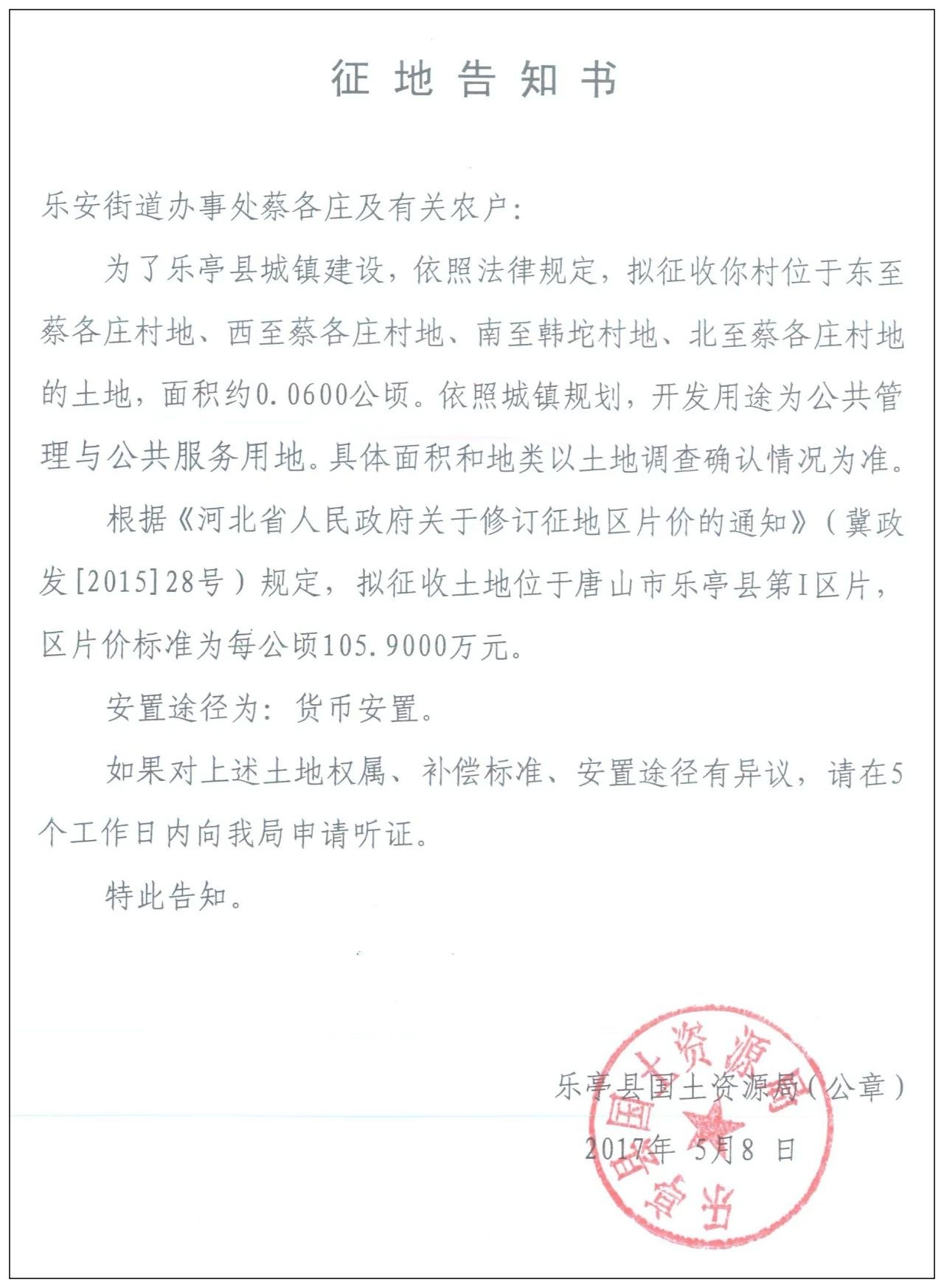 5月8日,樂(lè)亭縣人民政府網(wǎng)站發(fā)布樂(lè)亭縣2018年度第九批次建設(shè)用地征地告知書,共涉及8個(gè)村莊的17塊土地。 樂(lè)安街道辦事處楊鐵莊村 征收區(qū)域:東至楊鐵莊村地、西至關(guān)帝廟村地、南至楊鐵莊村地、北至楊鐵莊村地的土 ...