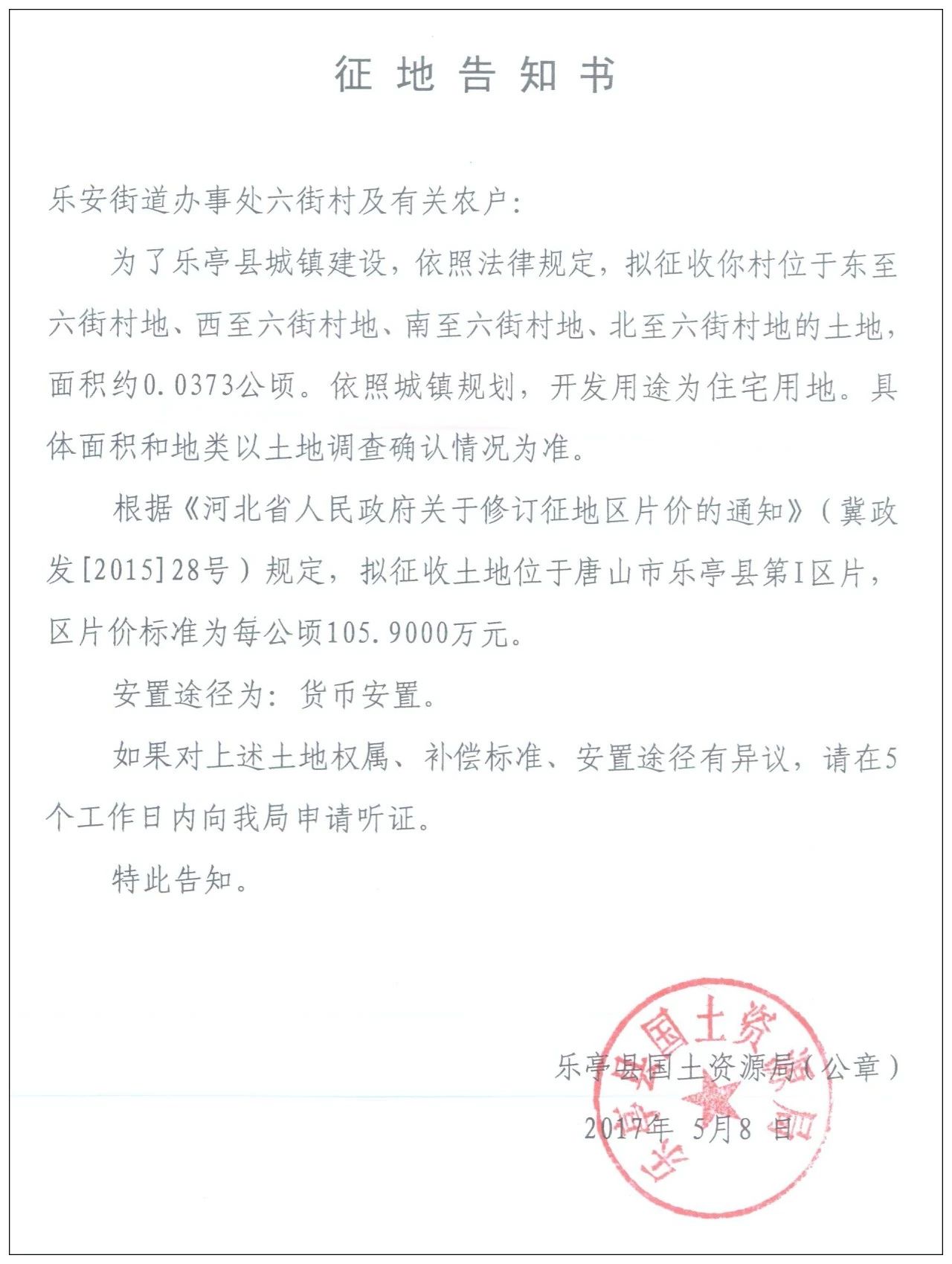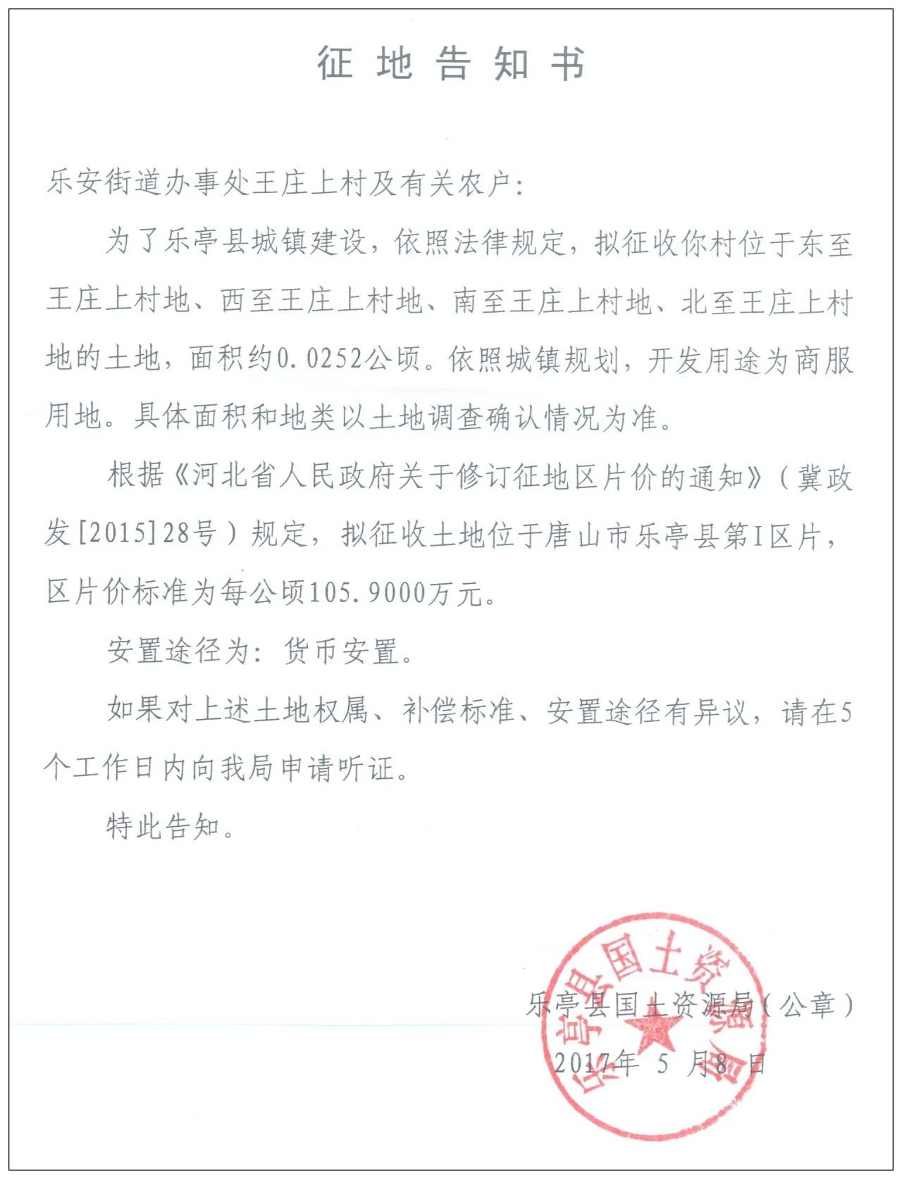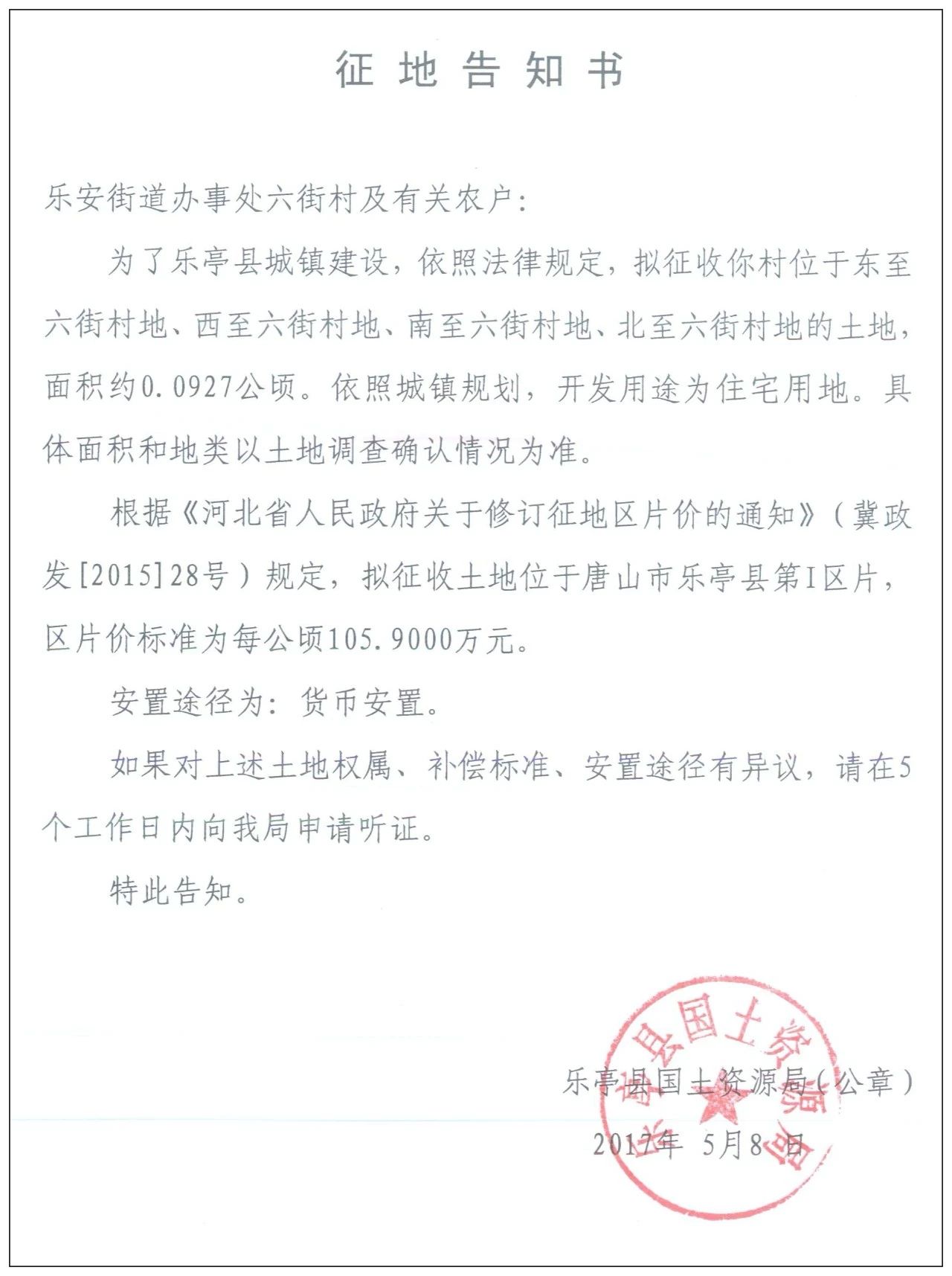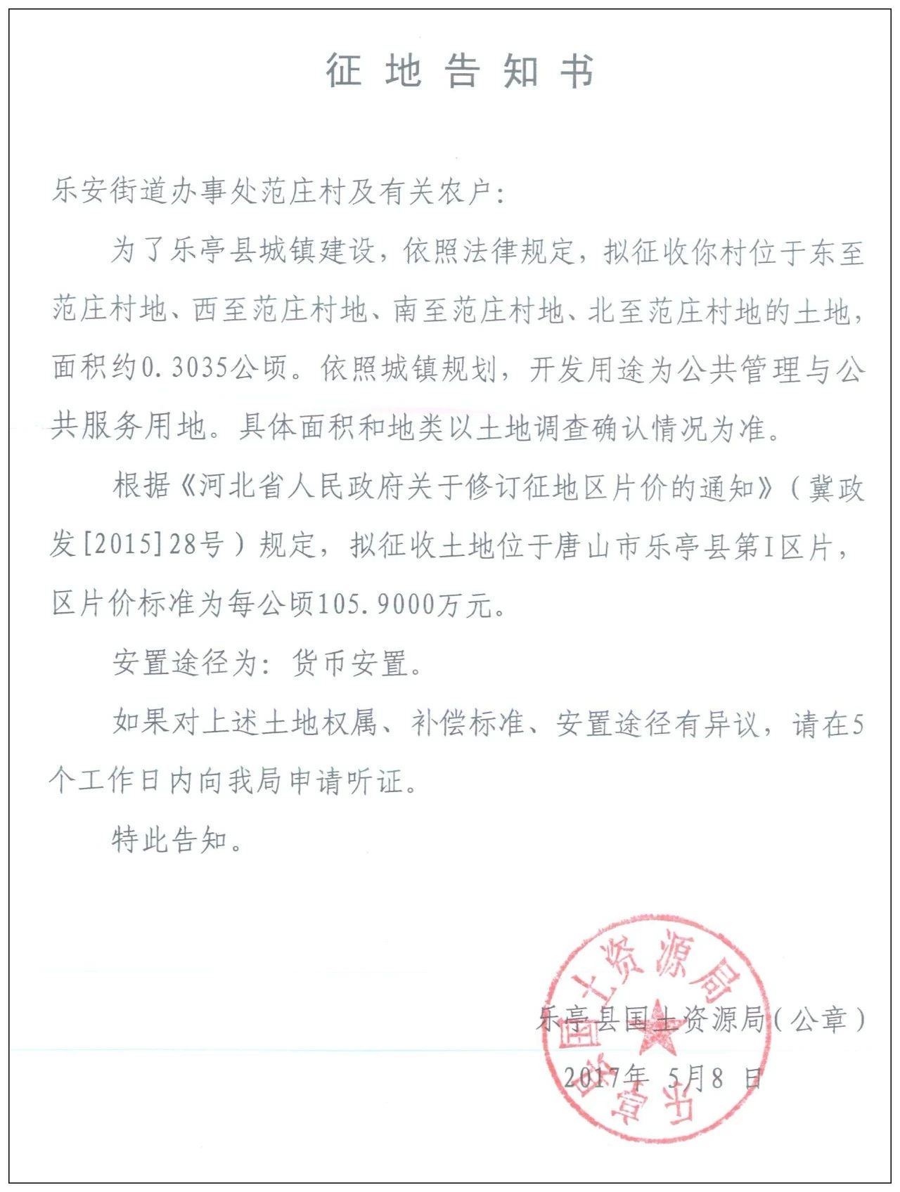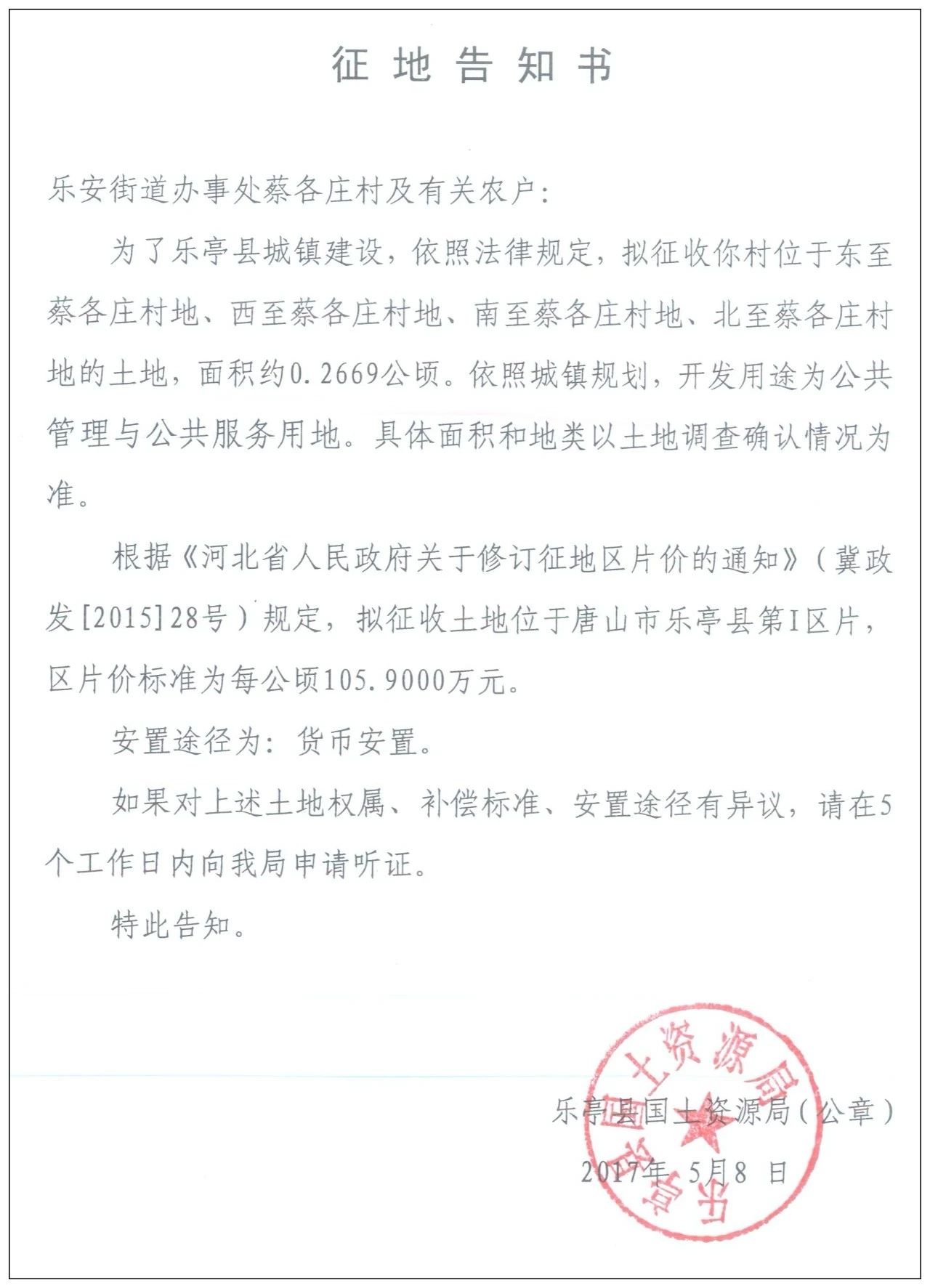 5月8日,樂(lè)亭縣人民政府網(wǎng)站發(fā)布樂(lè)亭縣2018年度第九批次建設(shè)用地征地告知書,共涉及8個(gè)村莊的17塊土地。 樂(lè)安街道辦事處楊鐵莊村 征收區(qū)域:東至楊鐵莊村地、西至關(guān)帝廟村地、南至楊鐵莊村地、北至楊鐵莊村地的土 ...