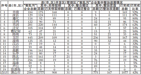 為進(jìn)一步推進(jìn)"散亂污"企業(yè)出清排查工作進(jìn)展,"散亂污"企業(yè)出清工作領(lǐng)導(dǎo)小組對全市各縣(市、區(qū))、開發(fā)區(qū)(管理區(qū))"散亂污"企業(yè)集中整治完成情況進(jìn)行了排名。排名前三位的分別為豐南區(qū),完成率92%;灤縣,完 ...