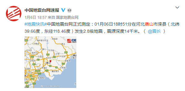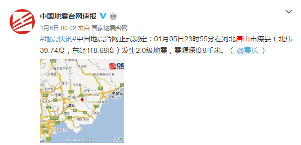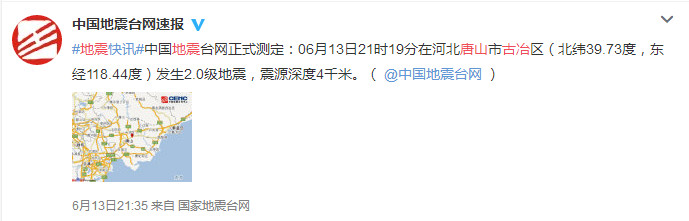 中國地震臺網(wǎng)正式測定6月13日21時19分在河北唐山市古冶區(qū)發(fā)生2.0級地震震源深度4千米震中位于北緯39.73度東經(jīng)118.44度 來源:中國地震臺網(wǎng)速報、央視新聞