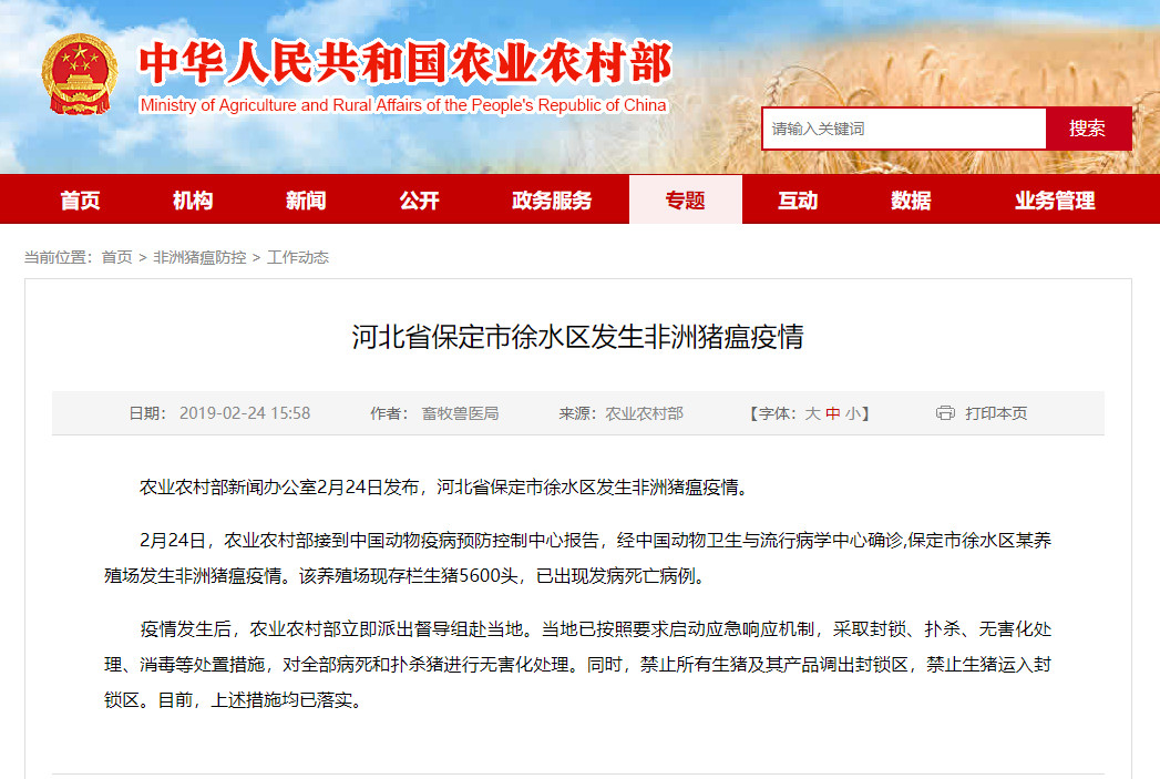 農(nóng)業(yè)農(nóng)村部新聞辦公室2月24日發(fā)布,河北省保定市徐水區(qū)發(fā)生非洲豬瘟疫情。 嚴(yán)格落實(shí)企業(yè)防疫主體責(zé)任 問(wèn):屠宰加工企業(yè)如何加強(qiáng)原料管控? 答:我國(guó)發(fā)生非洲豬瘟疫情以來(lái),所有已發(fā)疫情均已得到及時(shí)有效 ...