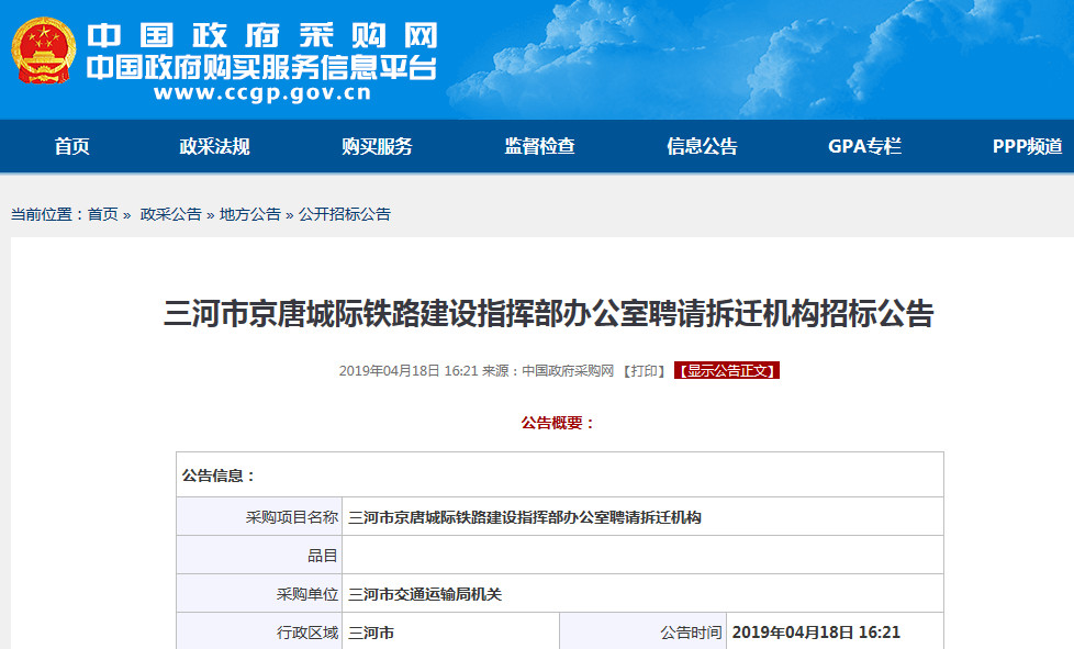 京唐城際鐵路燕郊段拆遷開始招標(biāo)了。 4月18日三河市京唐城際鐵路建設(shè)指揮部辦公室發(fā)布招標(biāo)公告,公開聘請(qǐng)拆遷機(jī)構(gòu)。 京唐城際起自北京城市副中心站, 向東沿既有線跨過(guò)潮白河后在既有燕郊站北側(cè)設(shè)燕郊站 ...