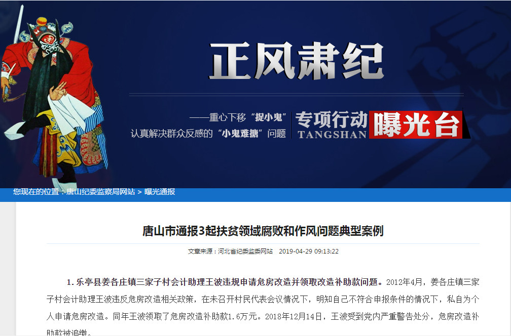 4月29日唐山市紀(jì)委監(jiān)委網(wǎng)站通報(bào)3起扶貧領(lǐng)域腐敗和作風(fēng)問題典型案例 1.樂亭縣姜各莊鎮(zhèn)三家子村會(huì)計(jì)助理王波違規(guī)申請(qǐng)危房改造并領(lǐng)取改造補(bǔ)助款問題。2012年4月,姜各莊鎮(zhèn)三家子村會(huì)計(jì)助理王波違反危房改造相 ...
