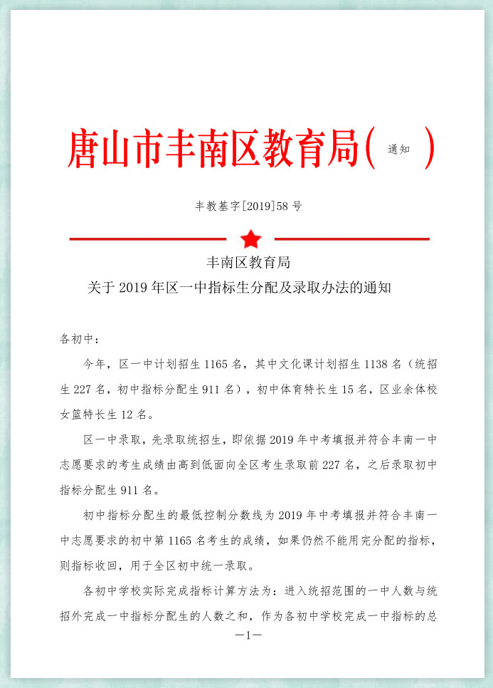 今年,豐南一中計劃招生1165名,其中統(tǒng)招生227名,指標分配生911名,招收體育特長生15 名,區(qū)業(yè)余體校女籃特長生12名。 來源:豐南區(qū)政府網(wǎng)