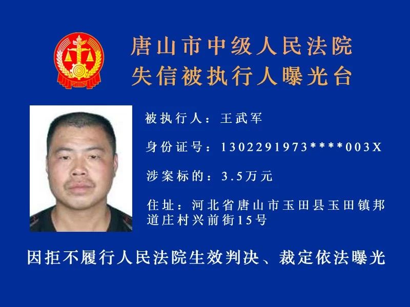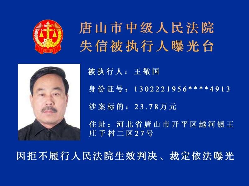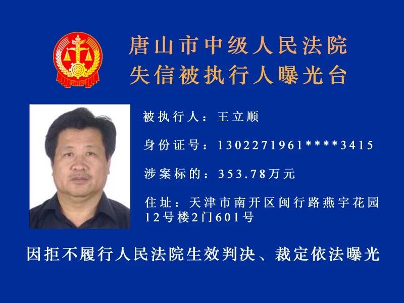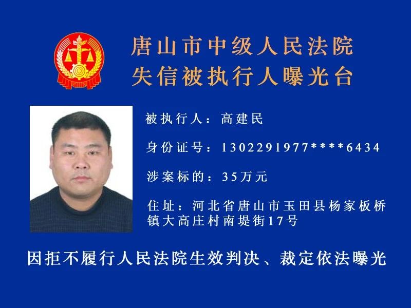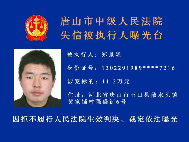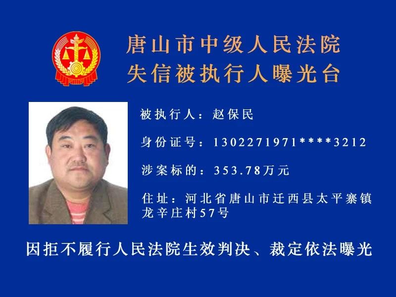 唐山市中級(jí)人民法院發(fā)布新一期失信被執(zhí)行人名單。 什么情形會(huì)被列入失信被執(zhí)行人名單被執(zhí)行人未履行生效法律文書確定的義務(wù),并具有下列情形之一的,人民法院應(yīng)當(dāng)將其納入失信被執(zhí)行人名單,依法對(duì)其進(jìn)行信用 ...