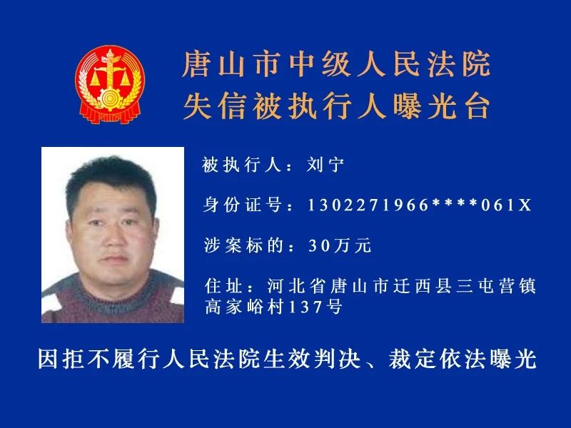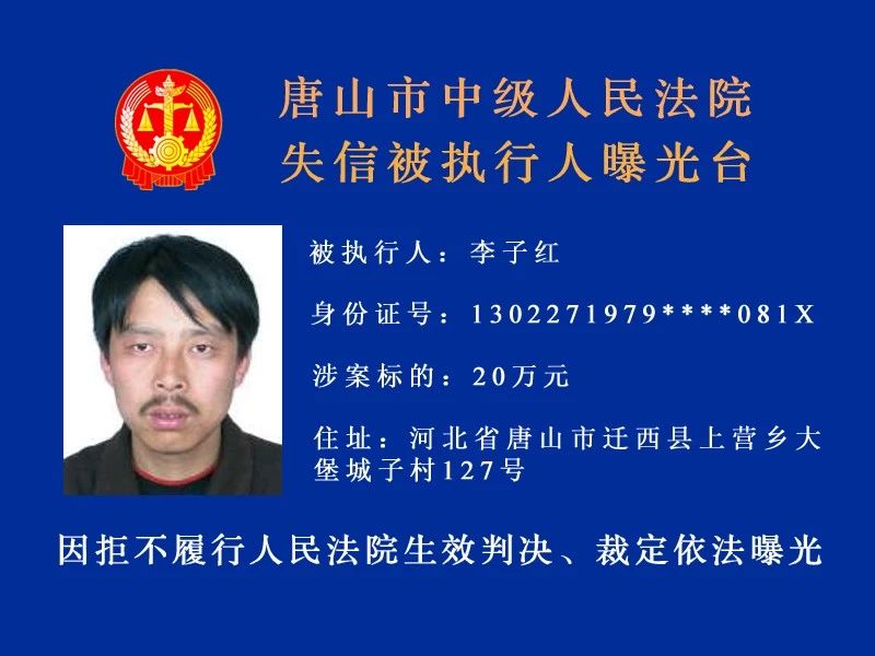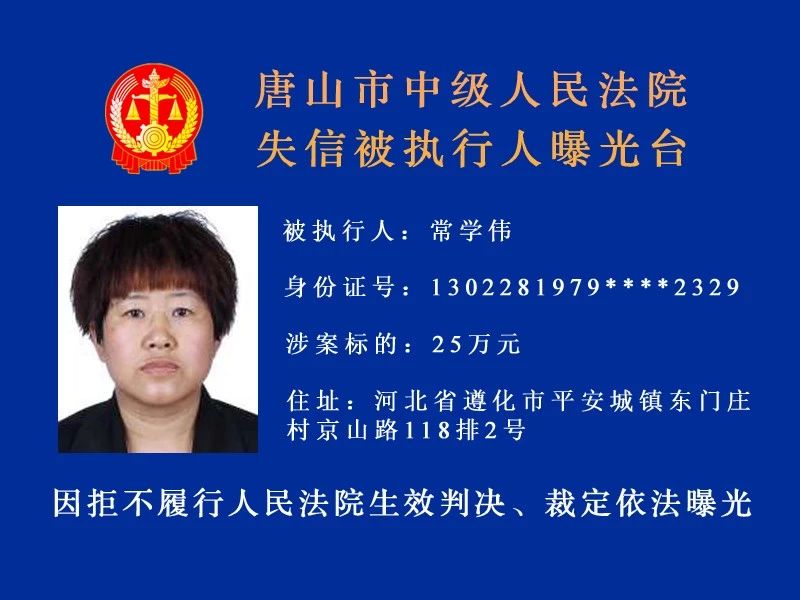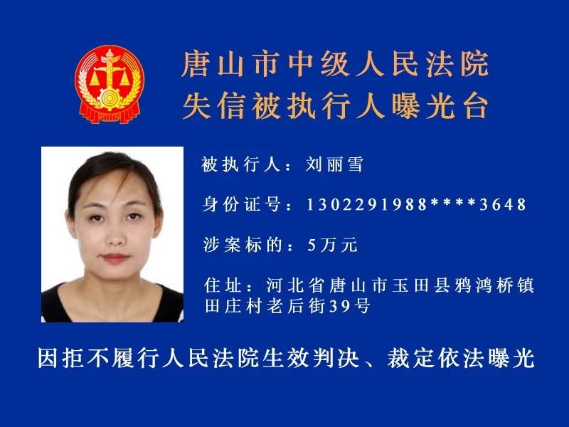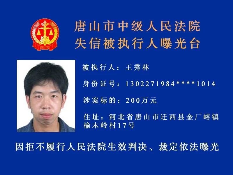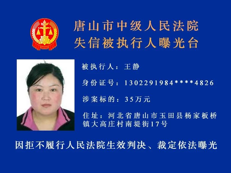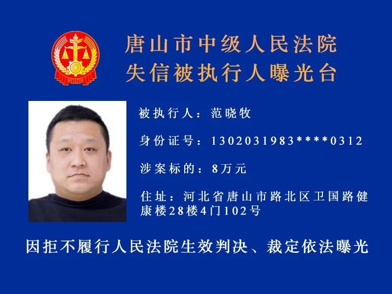 唐山市中級(jí)人民法院發(fā)布新一期失信被執(zhí)行人名單。 什么情形會(huì)被列入失信被執(zhí)行人名單被執(zhí)行人未履行生效法律文書確定的義務(wù),并具有下列情形之一的,人民法院應(yīng)當(dāng)將其納入失信被執(zhí)行人名單,依法對(duì)其進(jìn)行信用 ...