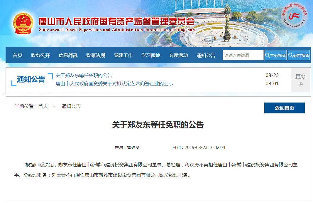 8月23日,唐山市人民政府國有資產(chǎn)監(jiān)督管理委員會發(fā)布2則任免公告。內(nèi)容如下: 關(guān)于鄭友東等任免職的公告 根據(jù)市委決定,鄭友東任唐山市新城市建設(shè)投資集團(tuán)有限公司董事、總經(jīng)理;蔣觀勇 ...