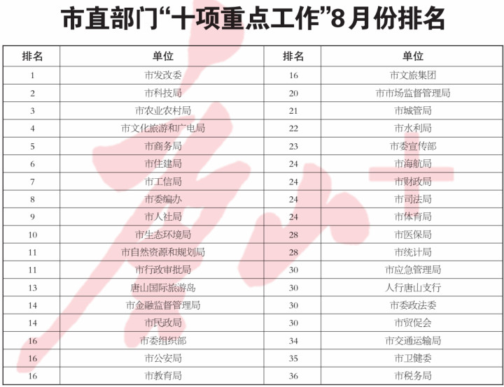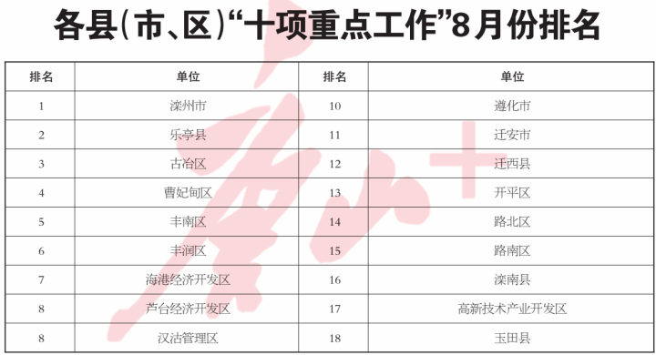 9月17日,《唐山勞動(dòng)日?qǐng)?bào)》刊登了《唐山市委市政府督查室關(guān)于市“十項(xiàng)重點(diǎn)工作”8月份任務(wù)完成情況的通報(bào)》,具體內(nèi)容看這里 今年8月份“十項(xiàng)重點(diǎn)工作”任務(wù)完成情況通報(bào)如下: 一、“十項(xiàng)重點(diǎn)工作”領(lǐng)導(dǎo)小組工 ...