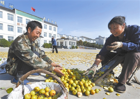 10月10日,灤州市楊柳莊鎮(zhèn)中趙莊子村村民趙師傅(左)一家在村民廣場加工晾曬安梨干,豐收的喜悅溢于言表。 中趙莊子村地處半山區(qū),主導(dǎo)產(chǎn)業(yè)是種植業(yè)和林果業(yè),林木覆蓋率達(dá)到72%。該村自去年 ...