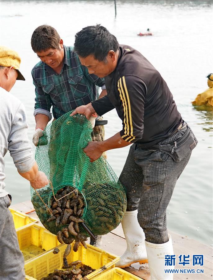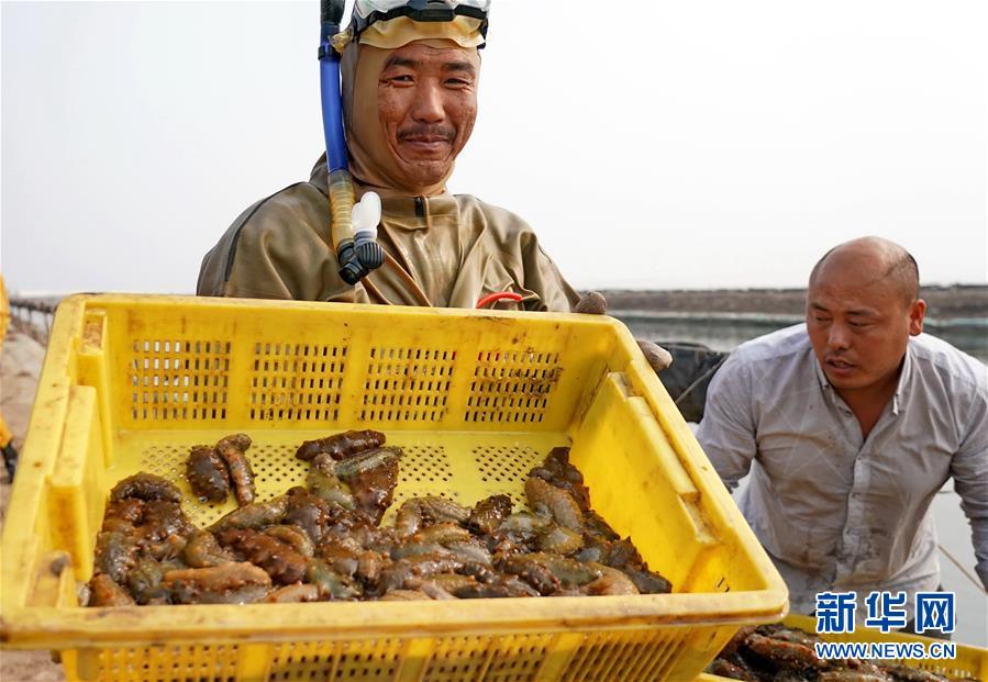 10月30日,樂亭縣姜各莊鎮(zhèn)一處海參養(yǎng)殖基地的工人在展示剛捕撈的海參。