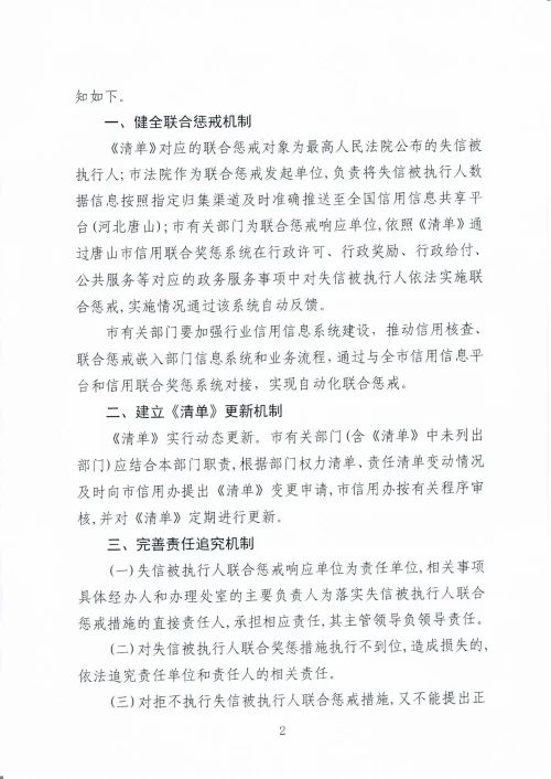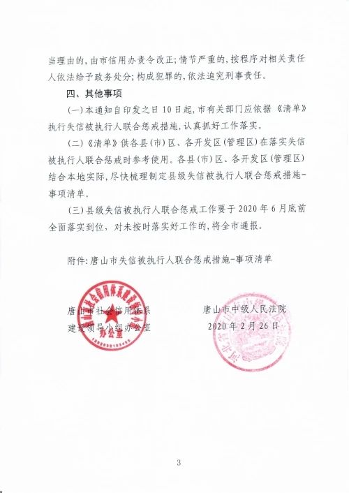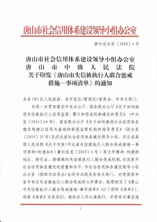 日前,唐山市信用辦發(fā)布關(guān)于印發(fā)《唐山市失信被執(zhí)行人聯(lián)合懲戒措施—事項(xiàng)清單》的通知,詳情如下: 重點(diǎn)提要 市政協(xié) 懲戒措施:失信被執(zhí)行人為個(gè)人的,換屆時(shí),不再繼續(xù)提名市政協(xié)委員 市委 ...