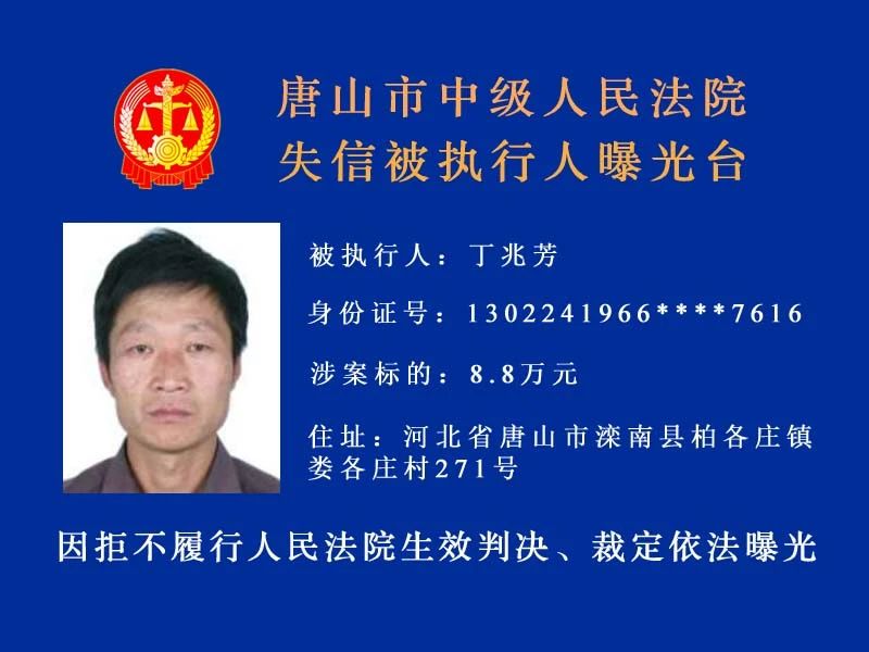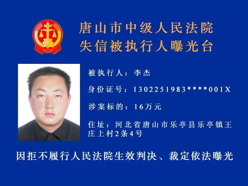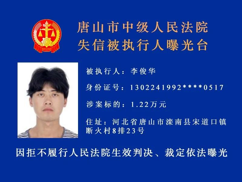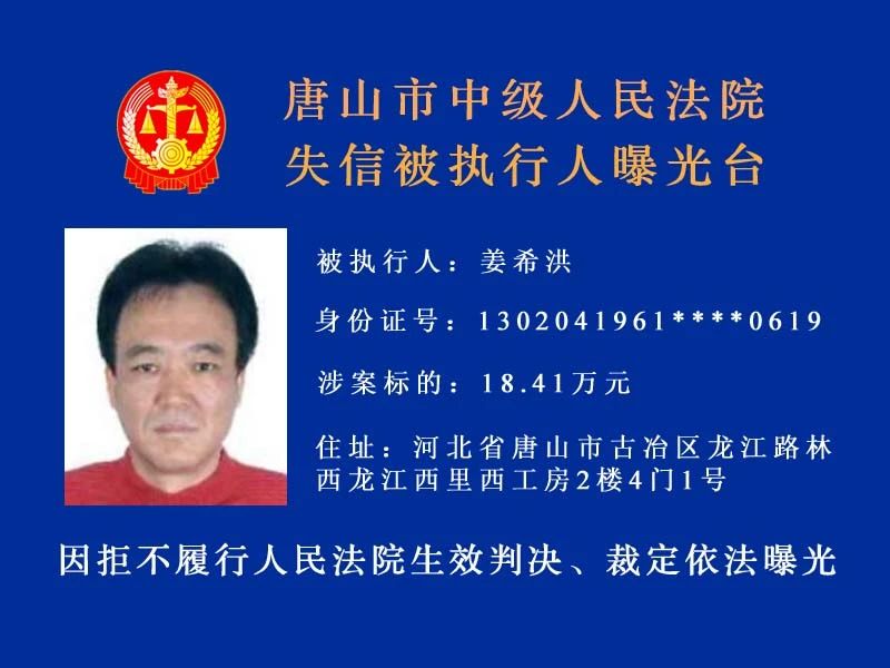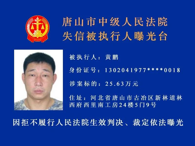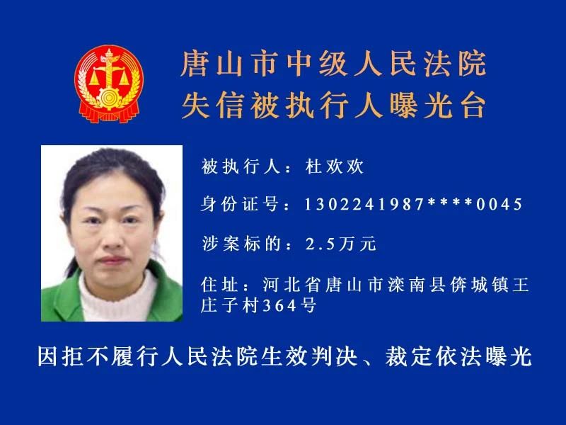 唐山市中級人民法院發(fā)布新一期失信被執(zhí)行人名單 守信光榮 失信可恥曝光不是目的希望更多的失信被執(zhí)行人自覺履行執(zhí)行義務(wù) 什么情形會被列入失信被執(zhí)行人名單 被執(zhí)行人未履行生效法律文書確定的義務(wù),并具有 ...