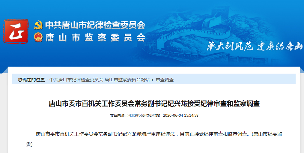 唐山市委市直機(jī)關(guān)工作委員會(huì)常務(wù)副書(shū)記紀(jì)興龍涉嫌嚴(yán)重違紀(jì)違法,目前正接受紀(jì)律審查和監(jiān)察調(diào)查。(唐山市紀(jì)委監(jiān)委) 來(lái)源:唐山市紀(jì)委監(jiān)委