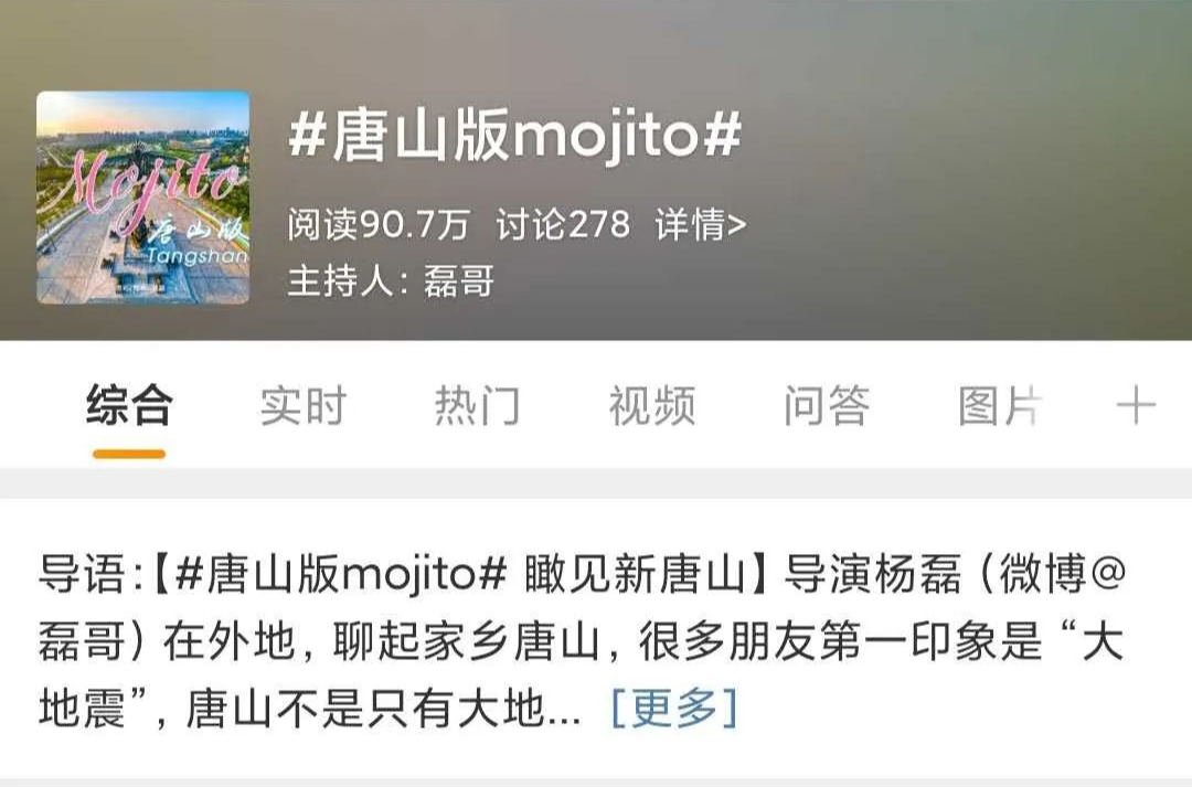 7月27日晚一個(gè)唐山版mojito的話題空降微博熱搜,截止昨天下午該話題閱讀數(shù)已超90萬(wàn)并被微博視頻官方等多個(gè)大V轉(zhuǎn)載,引起了網(wǎng)友的共同關(guān)注 @磊哥表 在 ...