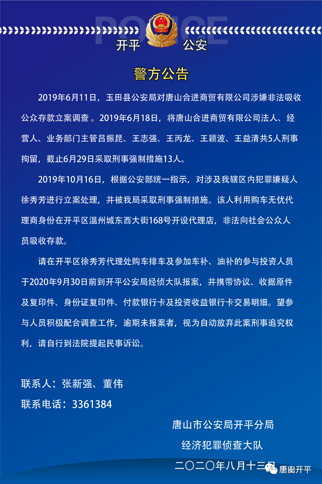 警方公告 2019年6月11日,玉田縣公安局對唐山合進商貿(mào)有限公司涉嫌非法吸收公眾存款立案調(diào)查。2019年6月18日,將唐山合進商貿(mào)有限公司法人、經(jīng)營人、業(yè)務部門主管呂振昆、王志強、王丙龍、王穎波、王益清共5 ...